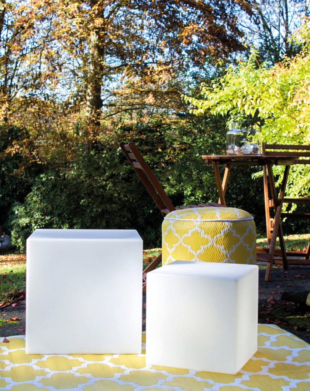 Wykonany z wysokiej jakości, wytrzymałego tworzywa sztucznego, podświetlany sześcian "Shining Cube" tworzy nastrojową atmosferę zarówno wewnątrz, jak i na zewnątrz, jako lampa, stolik boczny lub stołek. Kolor światła fabrycznie zainstalowanego źródła światła LED RGB można dowolnie wybierać za pomocą pilota zdalnego sterowania wchodzącego w zakres dostawy: dostępnych jest 15 kolorów z możliwością 5-stopniowego ściemniania. Absolutnie przyciąga wzrok, czując się jak w domu zarówno w pomieszczeniach, jak i w osłoniętych obszarach zewnętrznych.