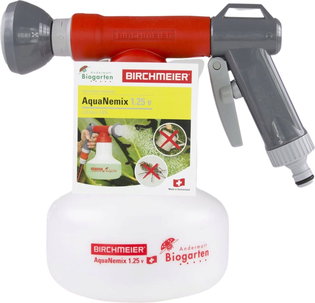AquaNemix to idealne urządzenie dozujące do stosowania nicieni lub płynnych nawozów organicznych. Opryskiwacz jest podłączany do węża ogrodowego za pomocą standardowego szybkozłącza (szybkozłącze nie wchodzi w zakres dostawy). Zintegrowany system dozowania miesza nicienie lub nawóz z wodą do nawadniania w stosunku 2%.