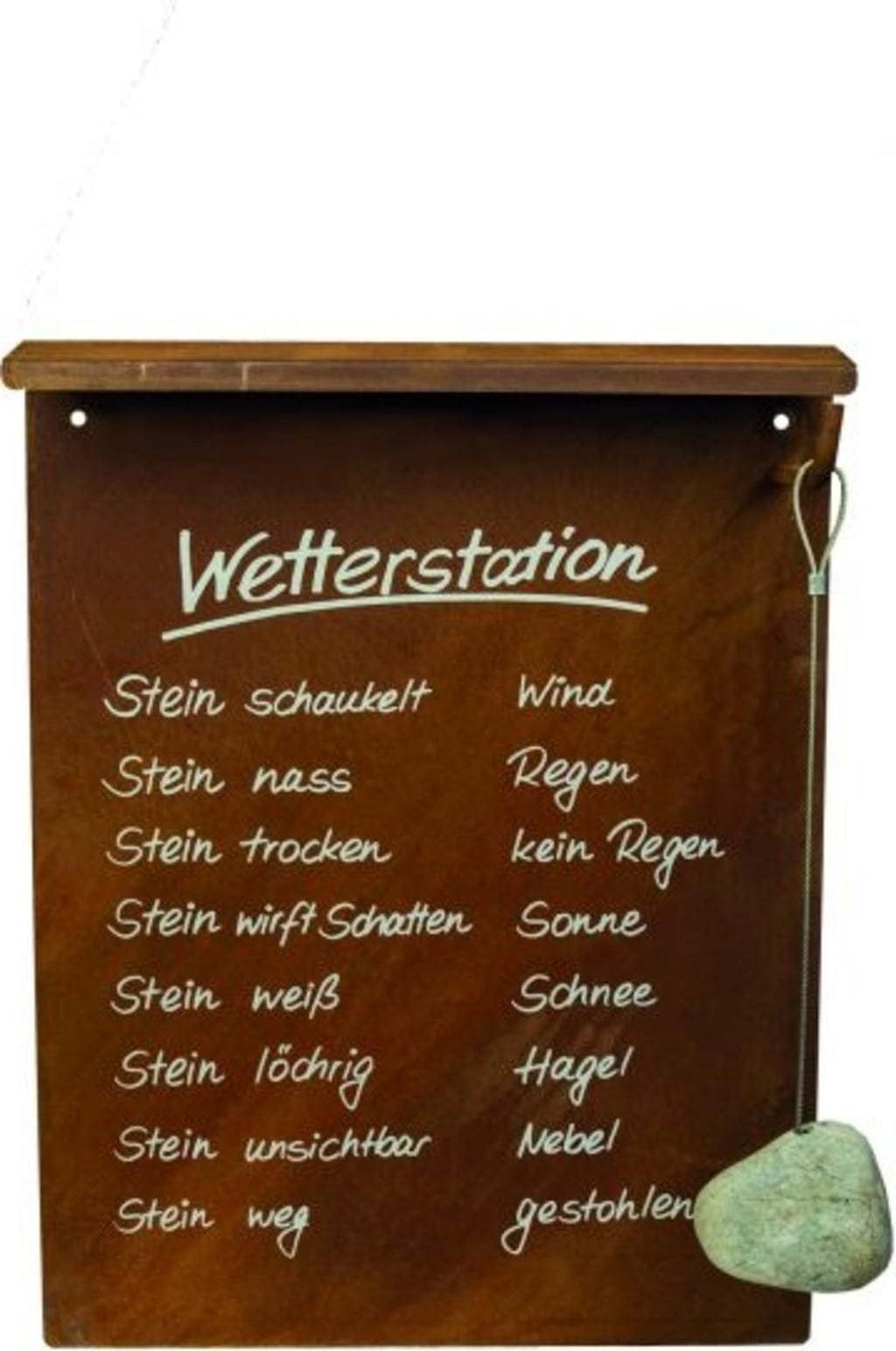 Dzięki tej stacji pogodowej nie jesteś już bezradny wobec nagłych zmian pogody, ale zawsze jesteś przygotowany na słońce, śnieg, lód i deszcz. Bardziej niezawodny niż jakikolwiek raport pogodowy, kamień dostarcza informacji o aktualnej sytuacji pogodowej i sprawi, że Ty i Twoi goście będziecie się śmiać z przymrużeniem oka.