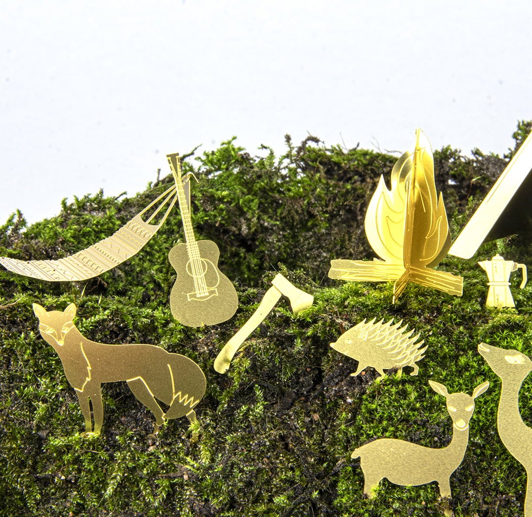 - Zestaw składa się z namiotu, kajaka, ogniska z ekspresem do kawy, piankami i siekierą, lornetki, gitary, dzięcioła, niedźwiedzia, dwóch jeleni, jeża, żaby, lisa i królika