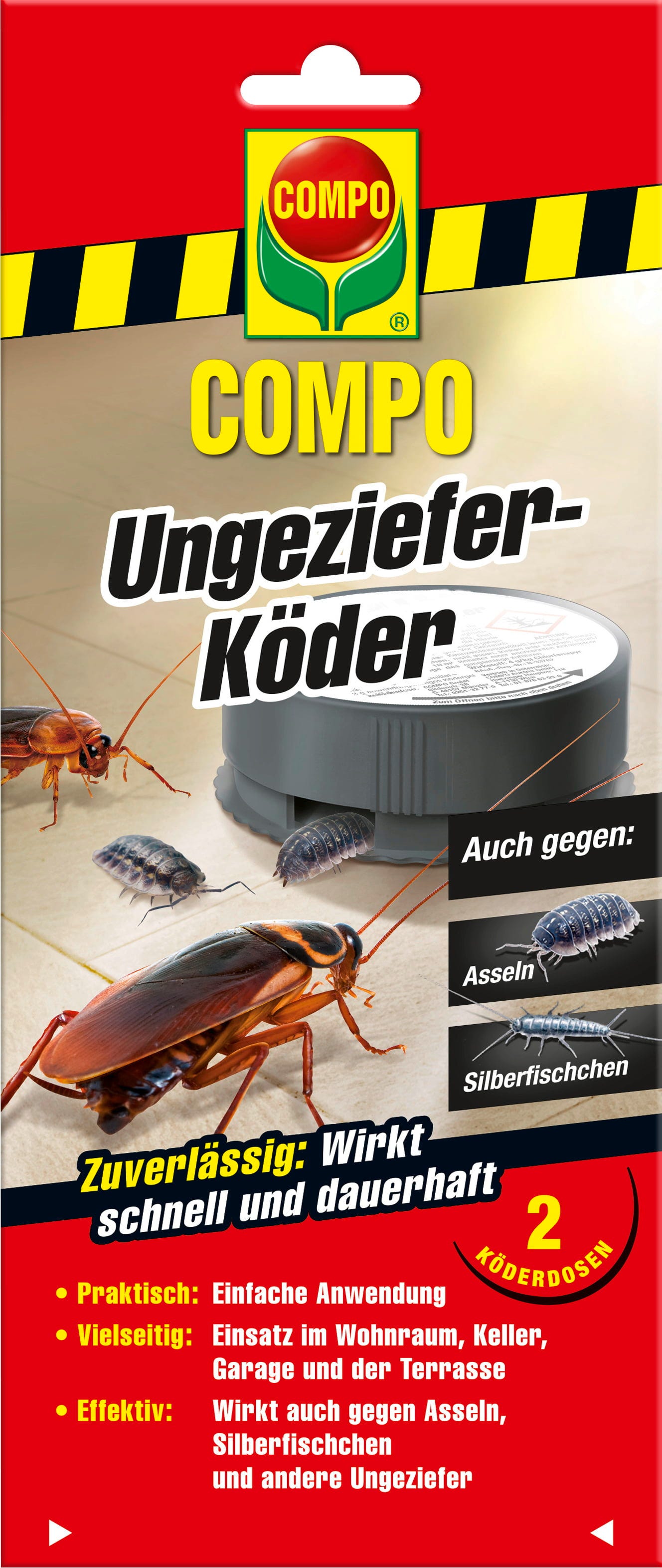 Przynęta na szkodniki COMPO niezawodnie zapewnia dom wolny od szkodników. Innowacyjna kombinacja atraktantów przyciąga szkodniki i skutecznie je zwalcza - bez wysychania, nawet po długim okresie użytkowania. Dzięki zabezpieczonej przed dziećmi puszce z przynętą jest ona szczególnie praktyczna i bezpieczna w użyciu, zarówno w domach prywatnych, jak i w restauracjach czy salonach sprzedaży.