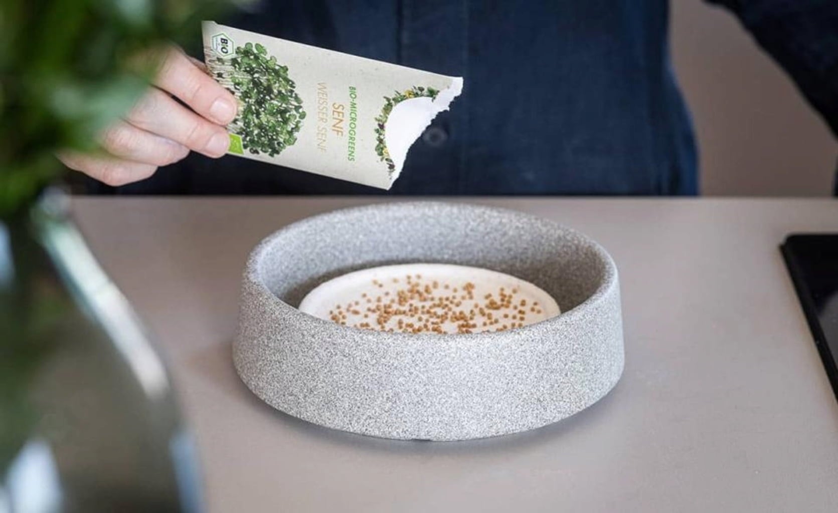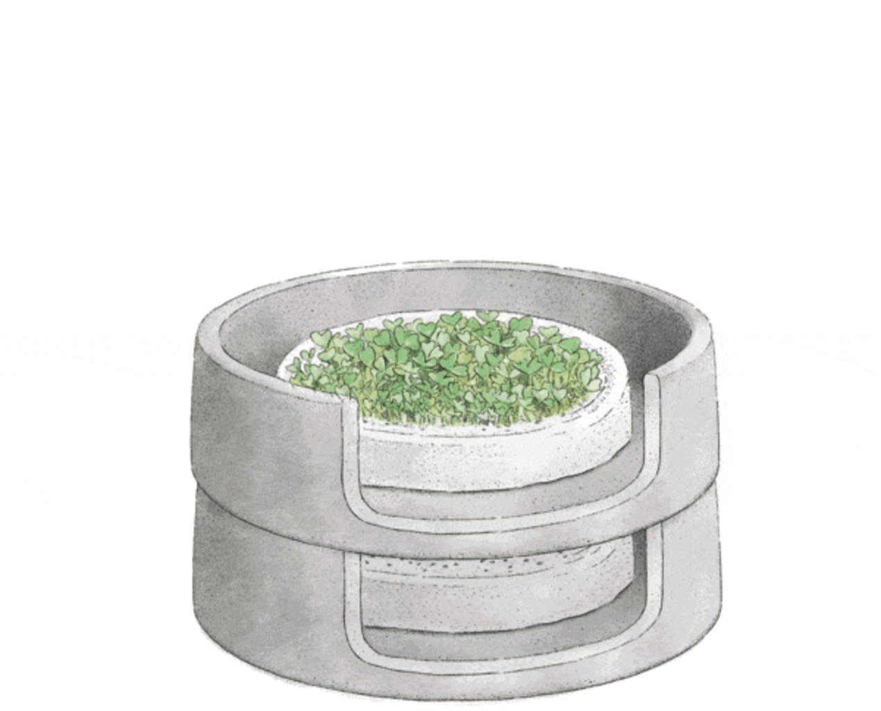 Opatentowany kamień do sadzenia z ceramiki Porosium® sprawia, że podłoże jest zbędne, a ten mikroogródek jest wyjątkowo zrównoważony, ponieważ można go używać wielokrotnie. Ponadto stwarza idealne warunki do kiełkowania i dzięki doskonałej zdolności do magazynowania wody zapewnia, że kiełki pozostają stale wilgotne, nie stojąc jednocześnie w nadmiarze wody. Zastój wody, a co za tym idzie pleśń, nie mają tu szans. Po zebraniu wszystkich Microgreens wystarczy usunąć korzenie i dokładnie umyć kamień pod gorącą wodą – i jest ponownie gotowy do użycia.