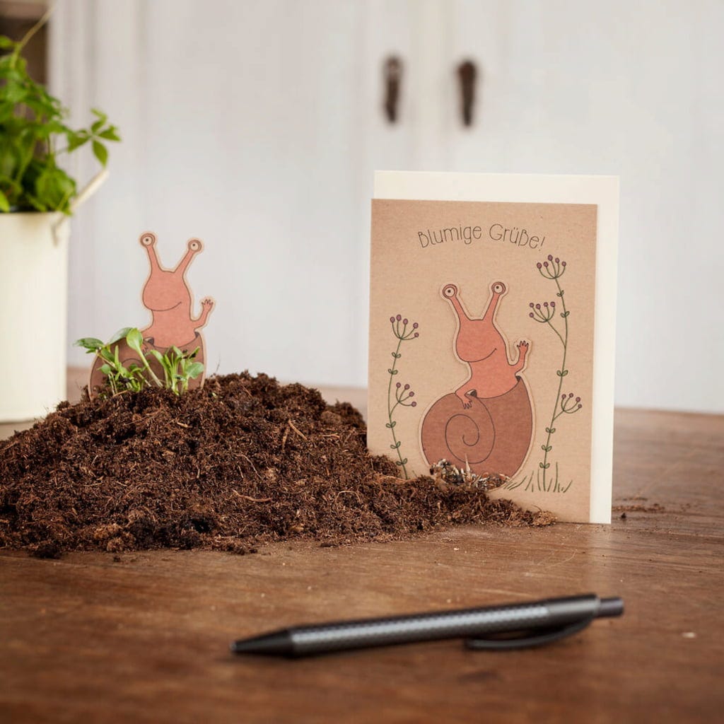 Ponieważ ślimak jest również nadrukowany na samej kartce, motyw pozostaje zachowany nawet po usunięciu papieru z nasionami.