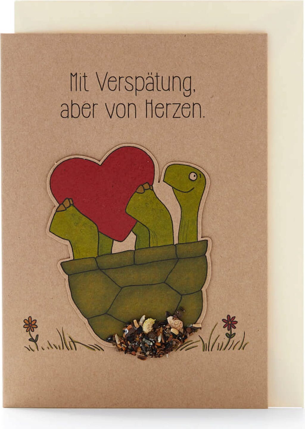 Ponieważ żółwie niestety nie należą do najszybszych, dotarcie życzeń może czasem chwilę potrwać. Tym większa jest jednak radość, gdy posłańcem jest tak urocze stworzenie jak na tej kartce. A co najlepsze: mały żółw, oprócz życzeń, przynosi ze sobą mnóstwo nasion, z których wyrosną najpiękniejsze dzikie kwiaty. Po prostu odczep żółwia od kartki, włóż go do ziemi i obficie podlej. Już po krótkim czasie powinny pojawić się pierwsze delikatne pędy.