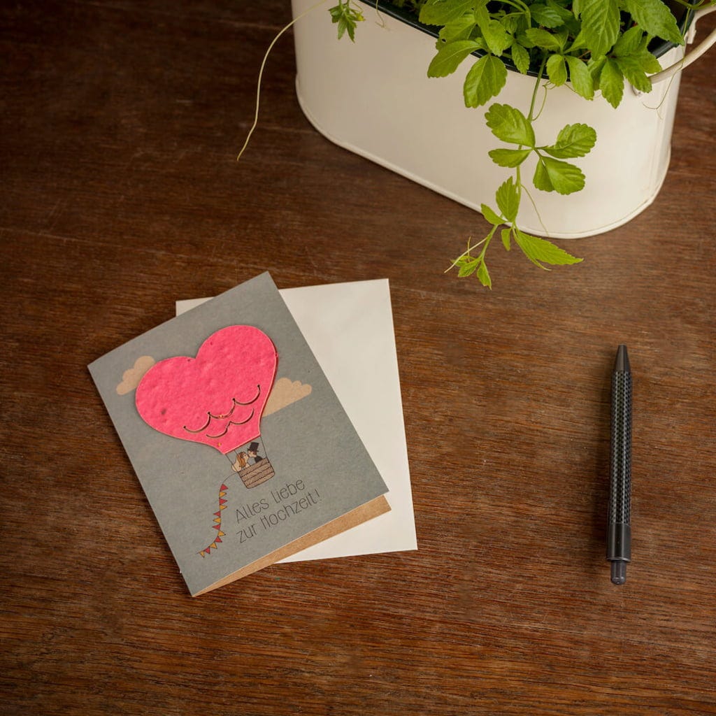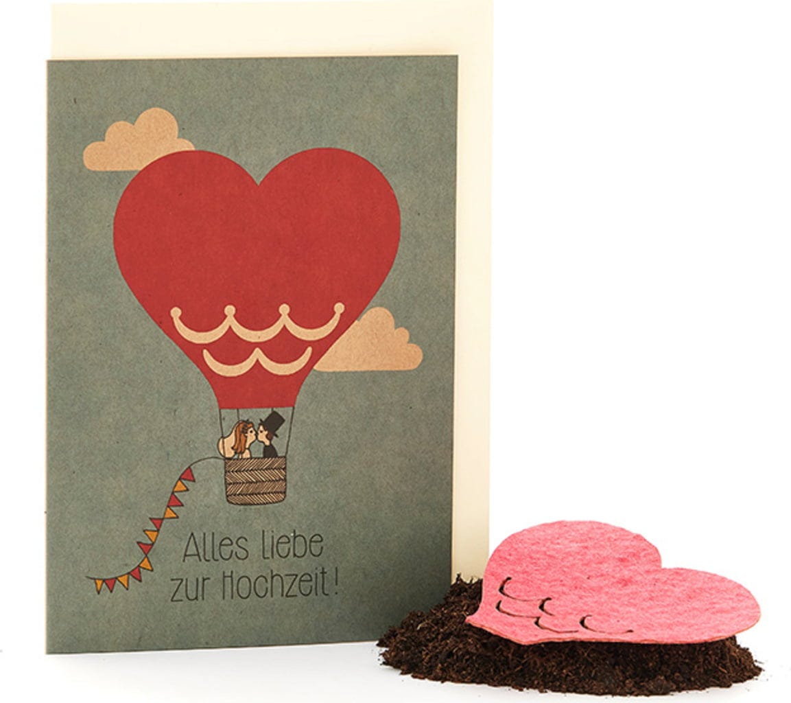 Kiedy dwoje ludzi się odnajduje i wpływa do portu małżeństwa, jest to wyjątkowy moment. To oczywiste, że chcesz przekazać szczęśliwej parze swoje najlepsze życzenia. Dzięki tej ślicznej kartce możesz zrobić to w szczególnie uroczy sposób i sprawić nowożeńcom niepowtarzalną radość. Balon na karcie jest bowiem wykonany z papieru nasiennego i jest pełen nasion, które w ziemi zamieniają się w przepiękne dzikie kwiaty. Idealny prezent na start we wspólne, szczęśliwe życie małżeńskie.