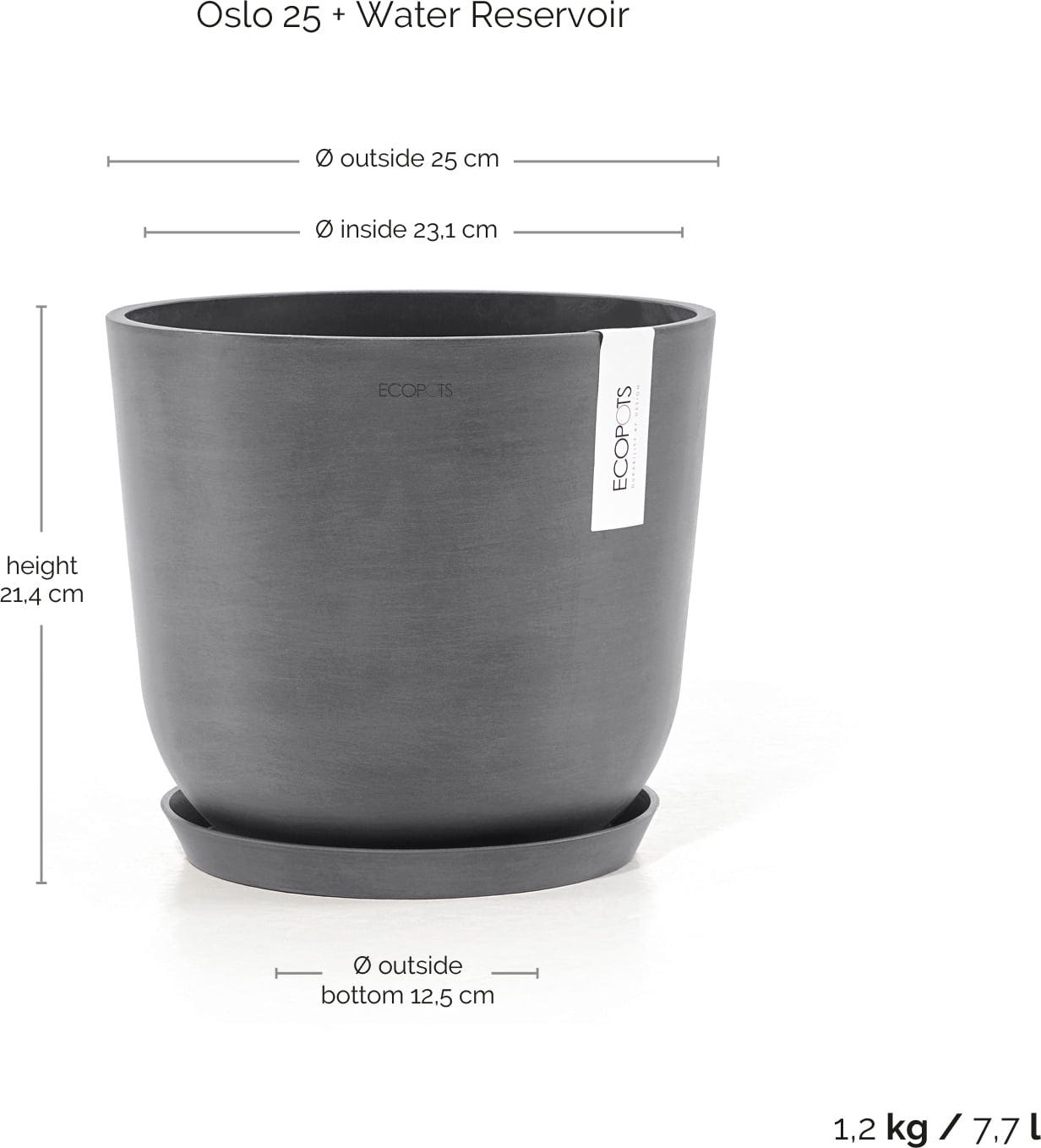 Ecopots Doniczka Oslo ze zbiornikiem na wodę - szara, Ø 25 cm, wysokość 21,80 cm
