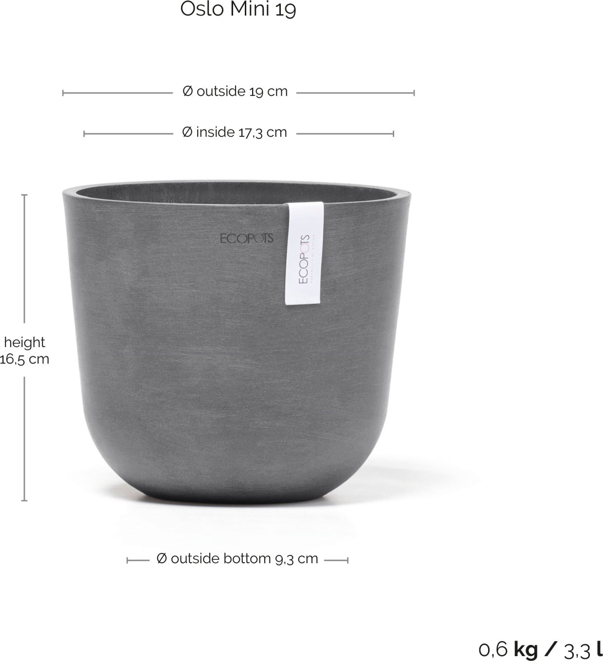Ecopots Oslo doniczka mini szara, Ø 19 cm, wysokość 16,5 cm