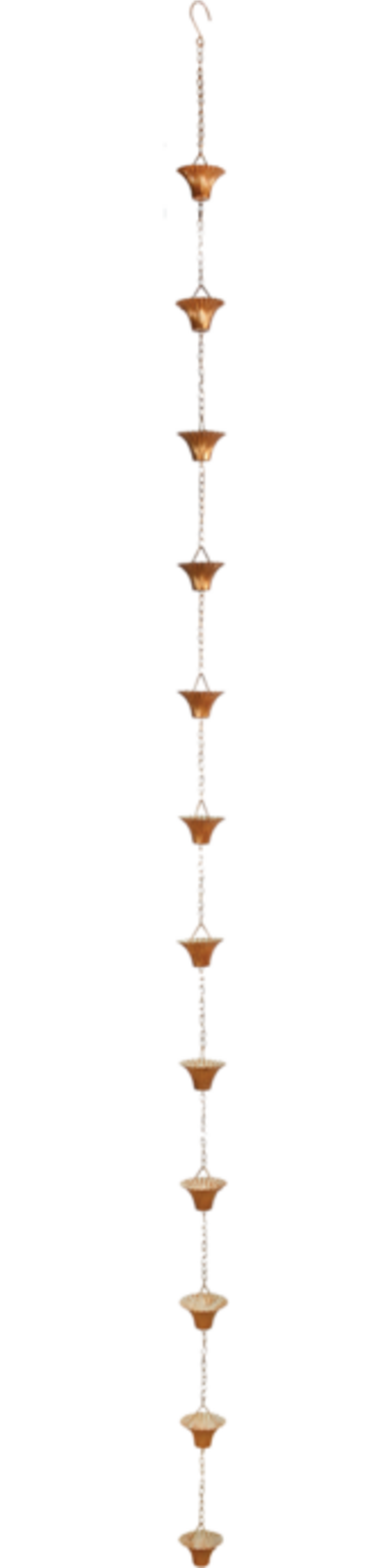Ten łańcuch przeciwdeszczowy łączy praktyczne zastosowanie z estetycznym wyglądem. Elegancko odprowadza wodę deszczową z dachu i dodaje stylowego akcentu do wejść, tarasów lub balkonów.