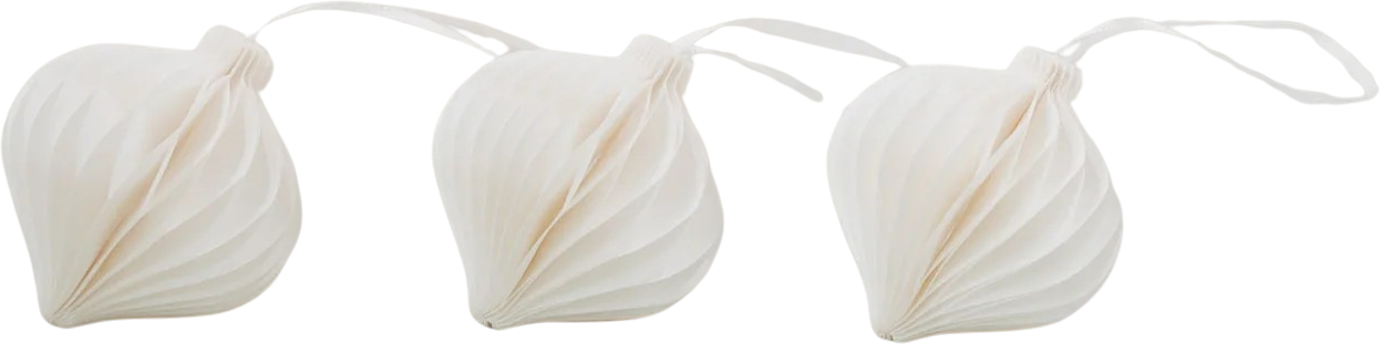 Papierowe zawieszki w zestawie 3 sztuk dodadzą naturalnego, eleganckiego akcentu każdej świątecznej dekoracji. Niezależnie od tego, czy chodzi o gałązki jodły, choinki, okna czy prezenty - kształty kropli lub dzwonka o wyglądzie plastra miodu tworzą subtelne, stylowe akcenty.