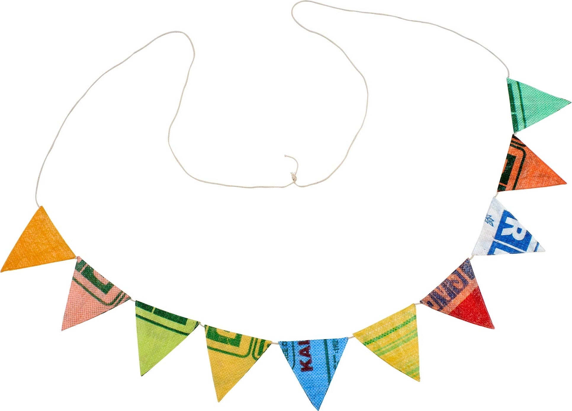 Przekształć swoją przestrzeń zewnętrzną w miejsce pełne radości życia i polegaj na prawdziwym rzemiośle z charakterem! Dzięki jaskrawym kolorom ta wyjątkowa girlanda natychmiast wprowadzi świąteczną atmosferę na następne przyjęcie w ogrodzie, a dzięki wytrzymałemu materiałowi z recyklingu z łatwością wytrzyma nawet niewielki deszcz. Każdy z dziesięciu trójkątów z proporczykami opowiada własną historię, ponieważ zostały one wykonane ręcznie ze zużytych worków ryżowych na Sri Lance - trzymasz więc w rękach naprawdę wyjątkowy przedmiot, którego nie można znaleźć nigdzie indziej.