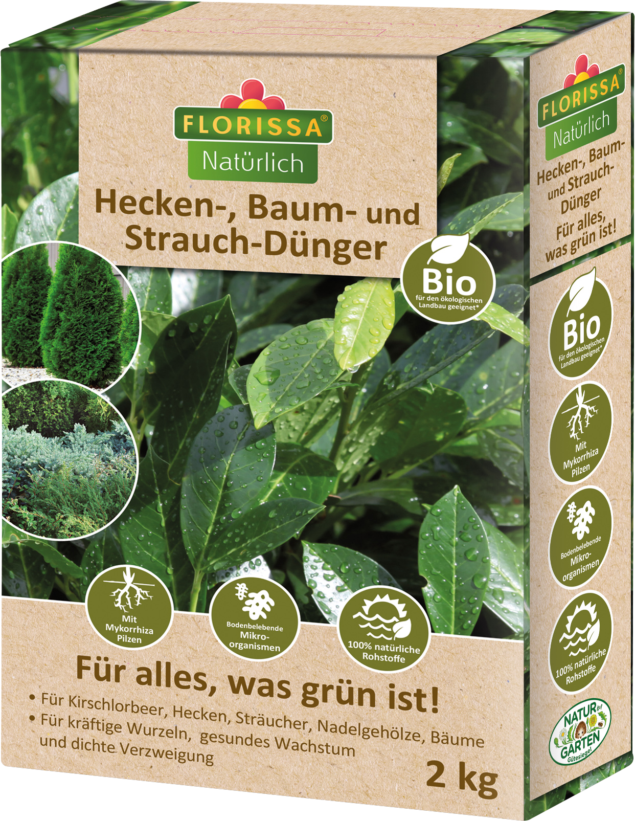 W idealnej sytuacji żywopłoty, krzewy i drzewa powinny rosnąć bujnie i gęsto się rozgałęziać. Naturalny kompletny nawóz Florissa sprzyja właśnie takim warunkom i sprawia, że liście i igły lśnią najpiękniejszą zielenią. Ponadto mikroorganizmy i grzyby mikoryzowe wspierają aktywne życie w glebie, co w dłuższej perspektywie przynosi korzyści roślinom.