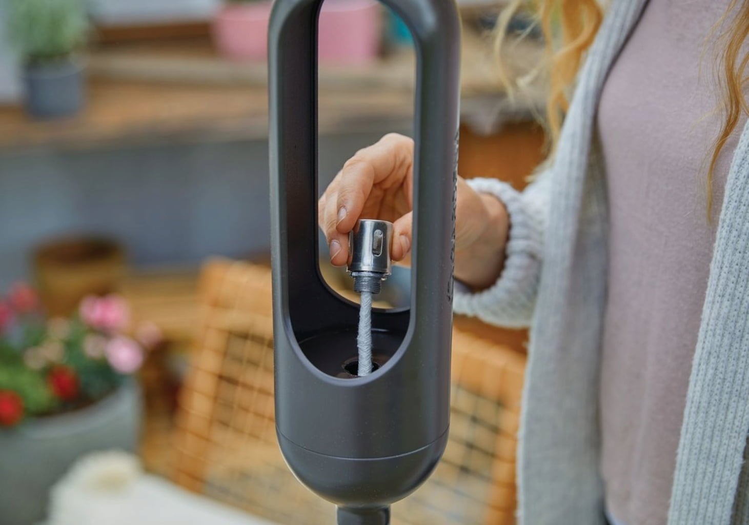 Pochodnia jest mocowana do uchwytu ClickUp! (patrz akcesoria) za pomocą jednego kliknięcia. Wystarczy napełnić zbiornik (o pojemności 350 ml) konwencjonalnym olejem do lamp, aby uzyskać co najmniej 6 godzin pięknego, ciepłego oświetlenia w ogrodzie.