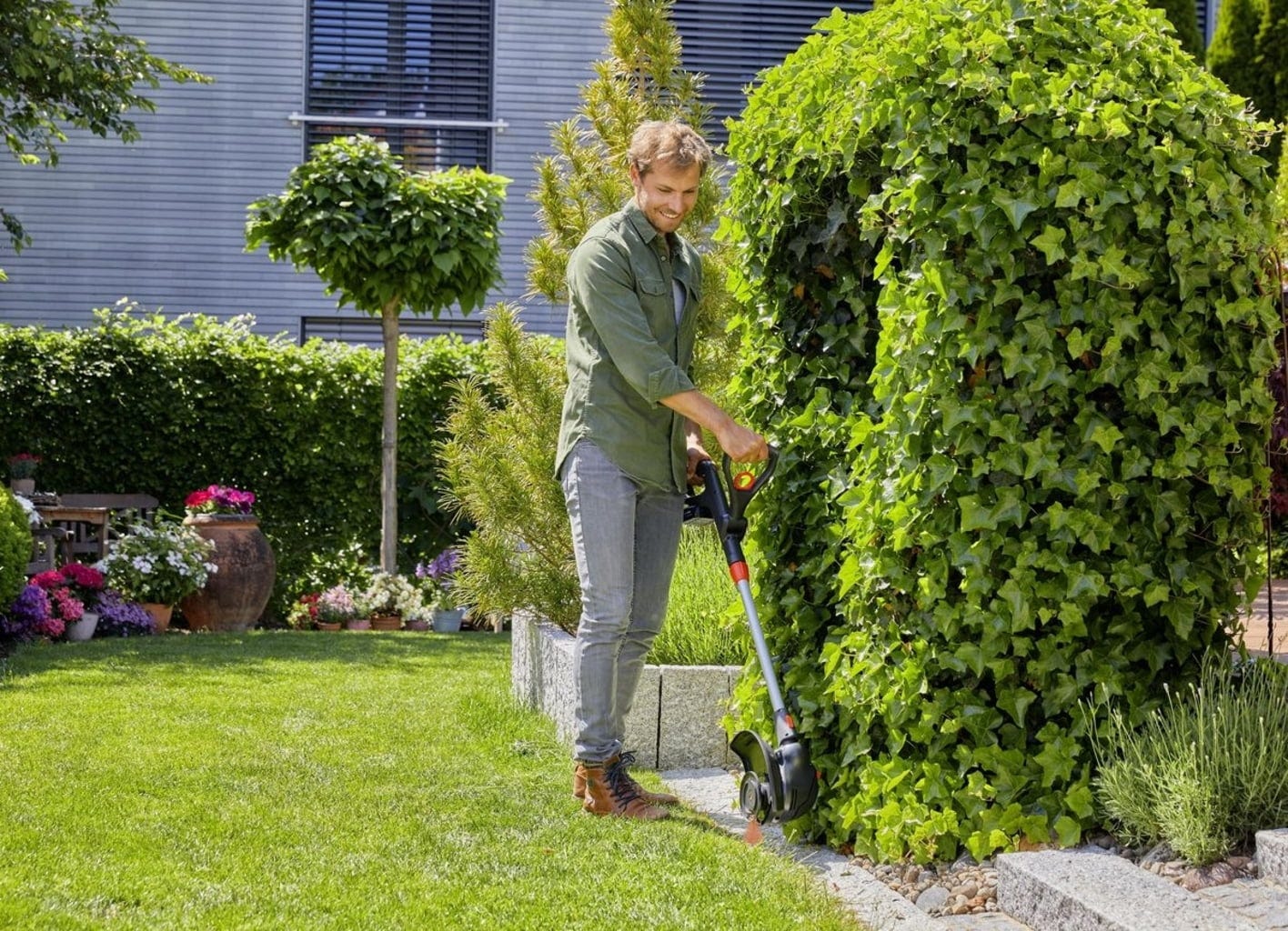 - Obrotowa głowica podkaszarki umożliwia precyzyjne przycinanie wystających krawędzi trawnika w pionie