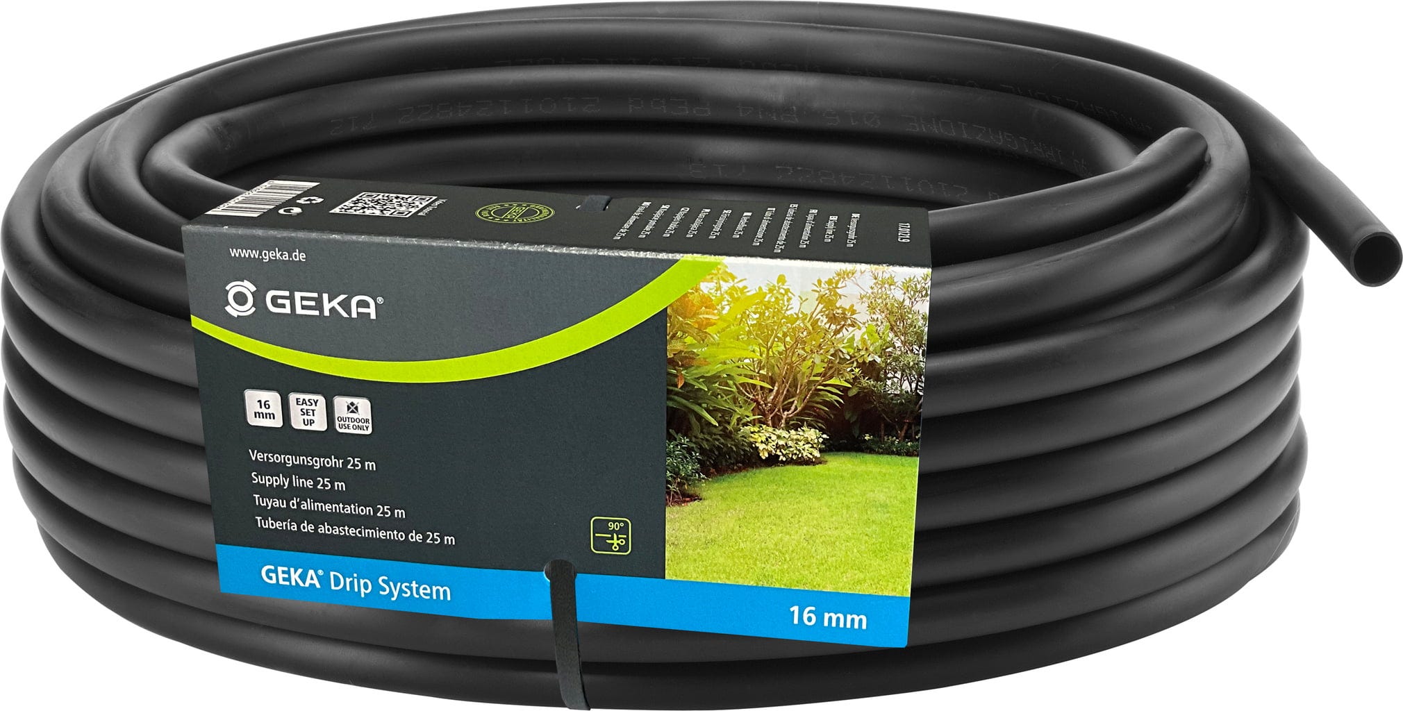 Rura zasilająca 16 mm jest częścią systemu GEKA Drip System i niezawodnie transportuje wodę do miejsca przeznaczenia. Może być układana zarówno nad, jak i pod ziemią, umożliwiając elastyczne zastosowanie.
