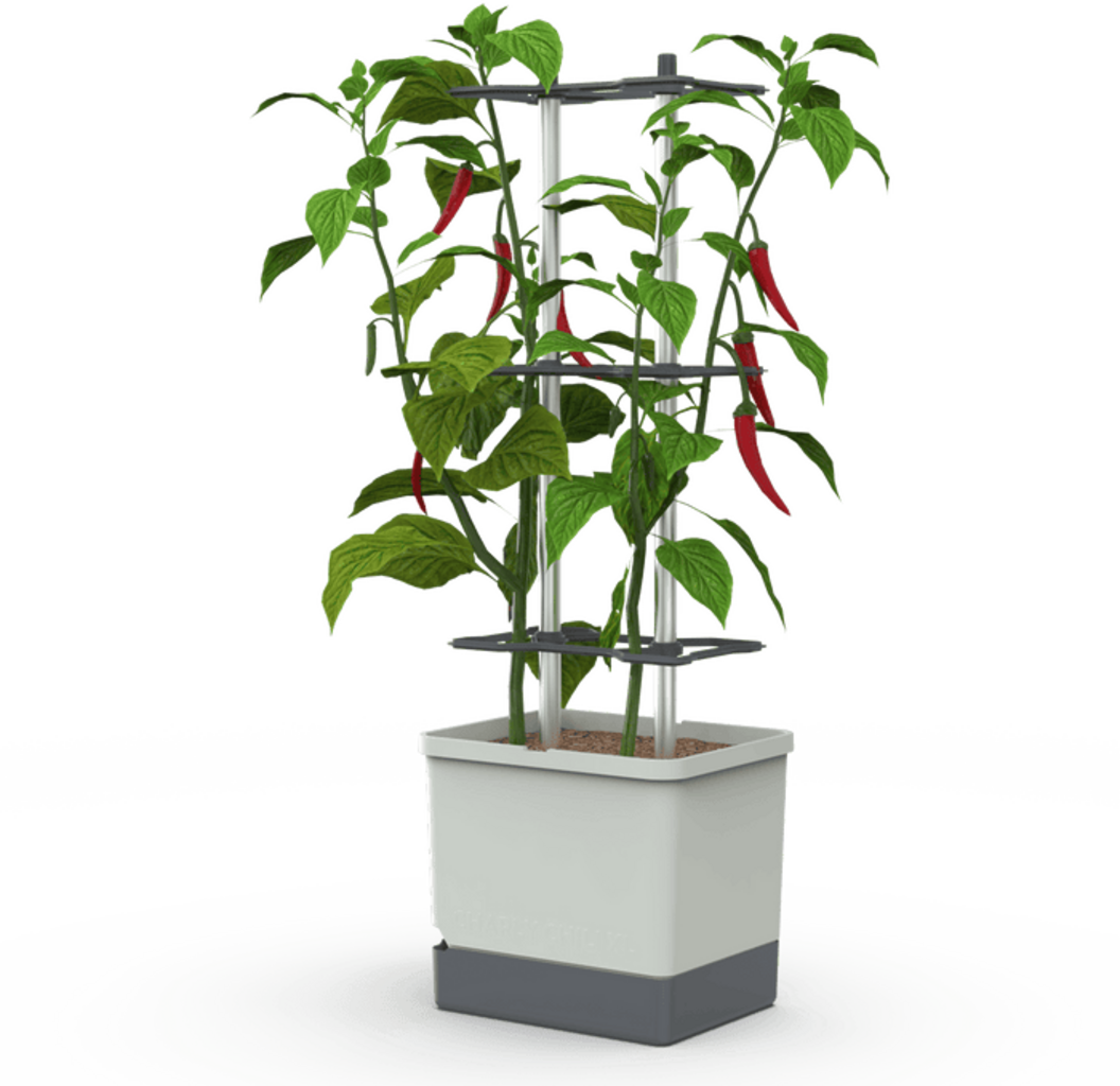 Podczas gdy zintegrowany system kratek wykonany z wysokiej jakości aluminium zapewnia papryce i chilli niezbędne wsparcie, zintegrowany zbiornik na wodę i paski nawadniające zapewniają, że rośliny są automatycznie zaopatrywane w odpowiednią ilość wody. Dzięki temu rośliny są nie tylko szczęśliwe, ale także zrelaksowane. Wszystko, czego teraz potrzebujesz, to 20 litrów ziemi i dwie rośliny chili lub papryki i jesteś gotowy do pracy.