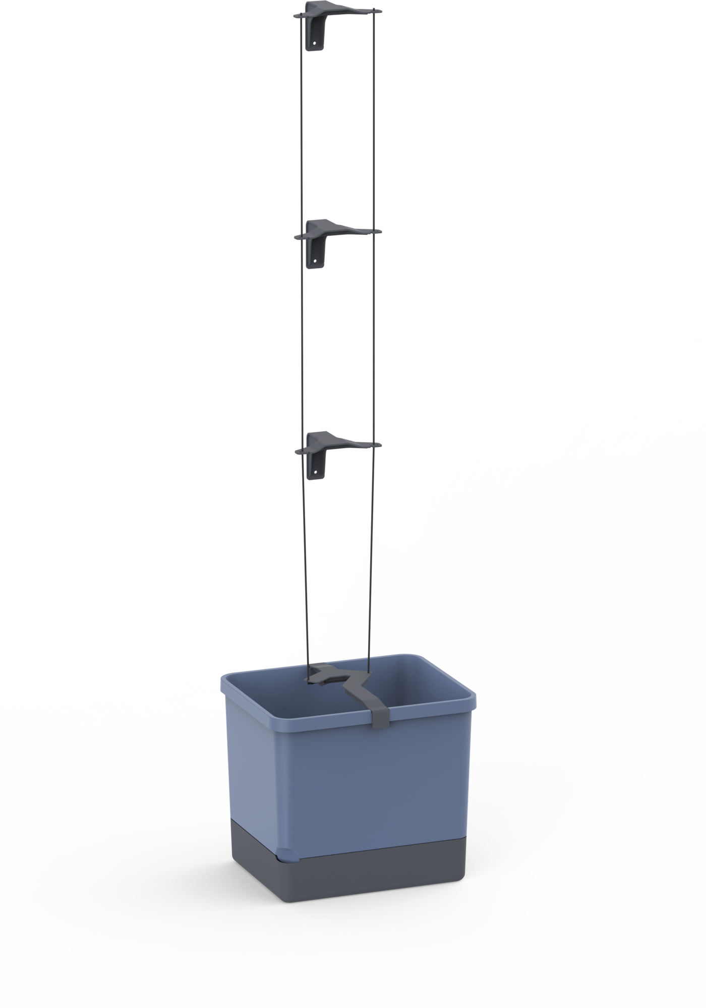 - Zakres dostawy: 1 doniczka, 1 zbiornik na wodę, 2 paski do podlewania, 1 krzyżak, 3 haki ścienne, 4 metry linki