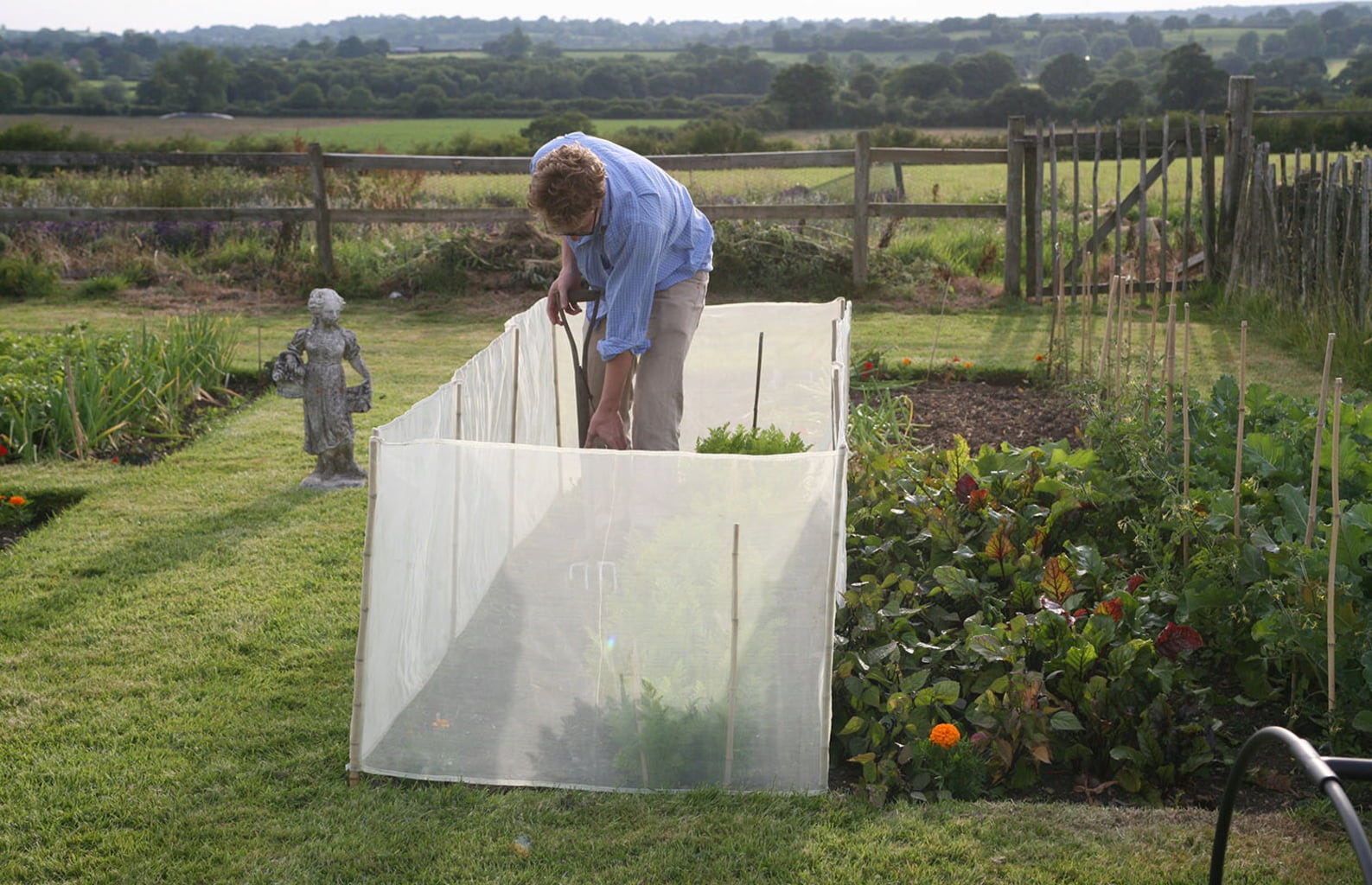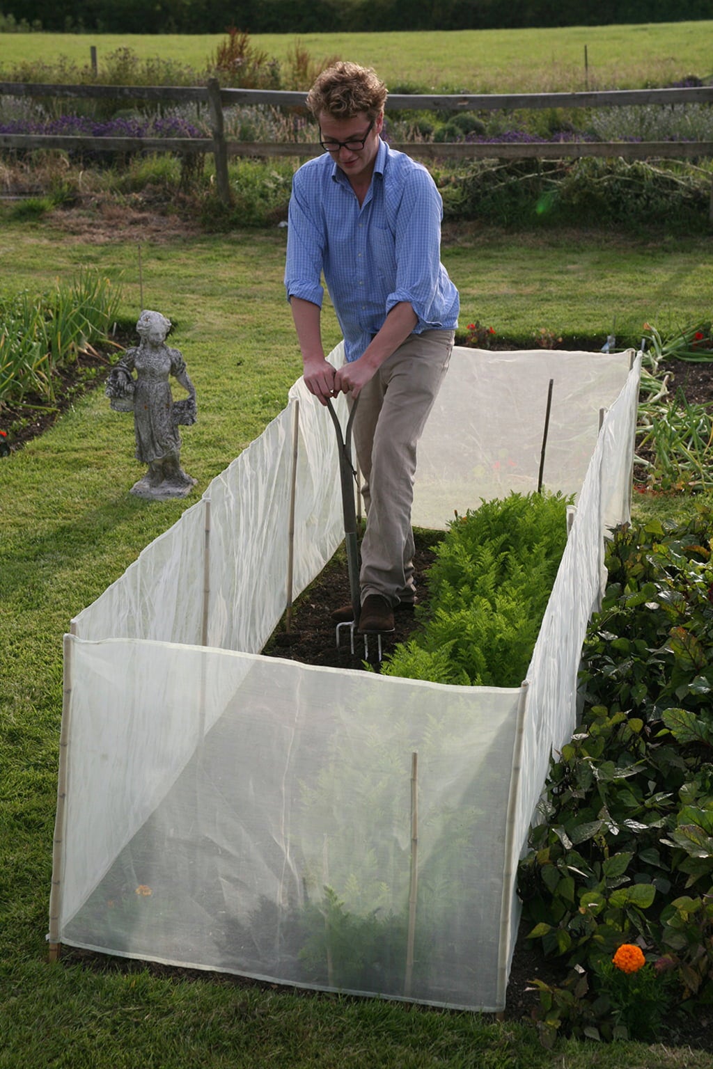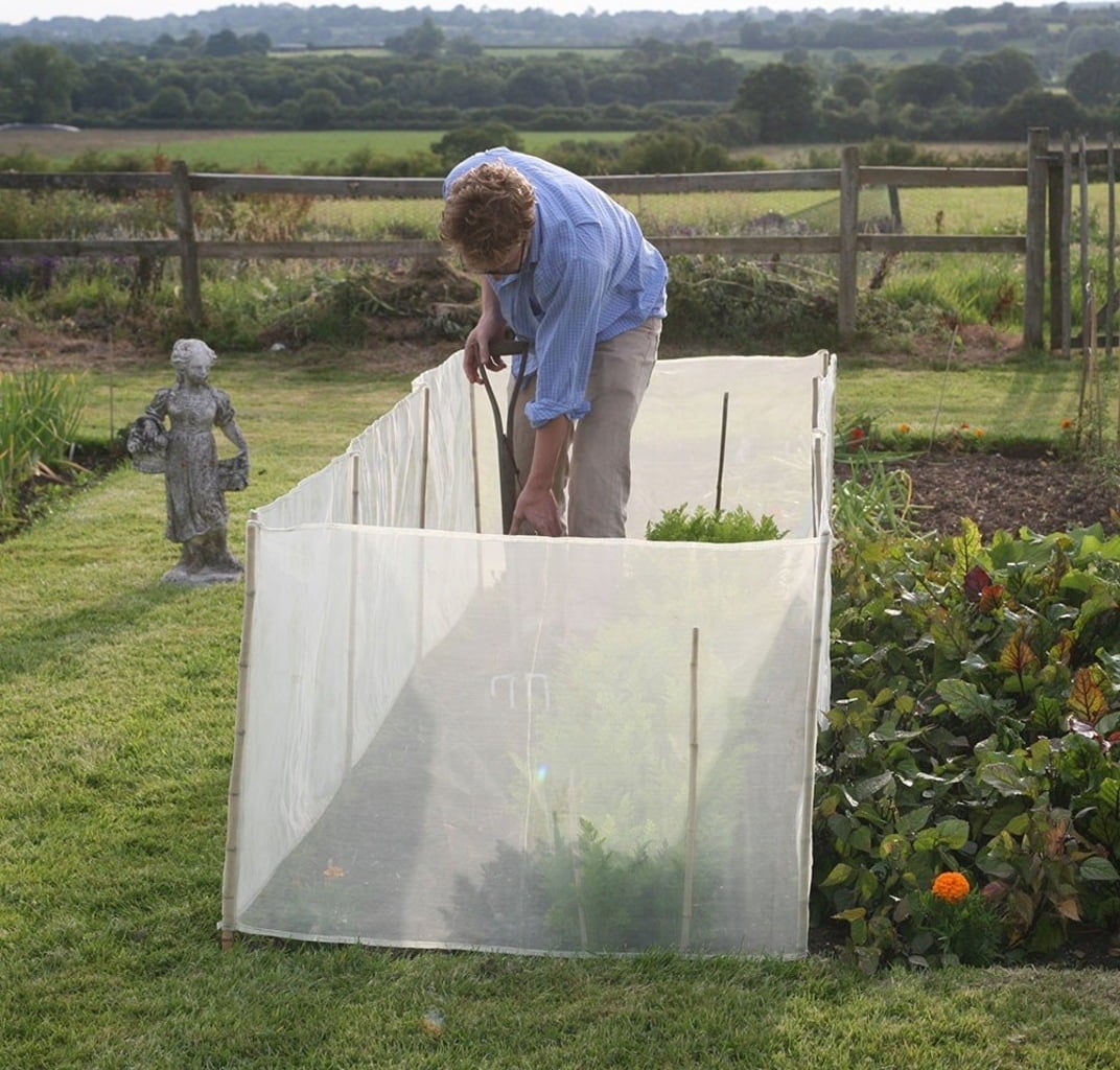 Ta ciasno tkana siatka ma zaledwie 0,6 mm grubości i posiada zintegrowane bambusowe wsporniki, które można dostosować do ogrodzenia szerokiej gamy działek i grządek. Tkanina jest półprzezroczysta i przepuszcza wystarczającą ilość wody, aby zapobiec wysychaniu roślin. Osłona przed wiatrem i warunkami atmosferycznymi jest nie tylko idealna na niewygodne warunki pogodowe, ale także chroni grządki przed zwierzętami domowymi i nisko latającymi szkodnikami. Ochrona przed wiatrem i warunkami atmosferycznymi okazała się szczególnie skuteczna przeciwko połyśnicą marchwianką.