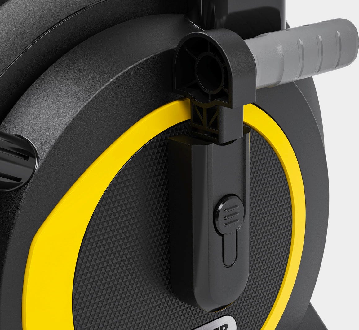 Dzięki ergonomicznej korbie wąż można szybko i w kontrolowany sposób zwinąć. Stabilna podstawa zapewnia bezpieczne oparcie podczas użytkowania. Uchwyt o regulowanej wysokości dodatkowo ułatwia transport w ogrodzie i pozwala na komfortową obsługę.