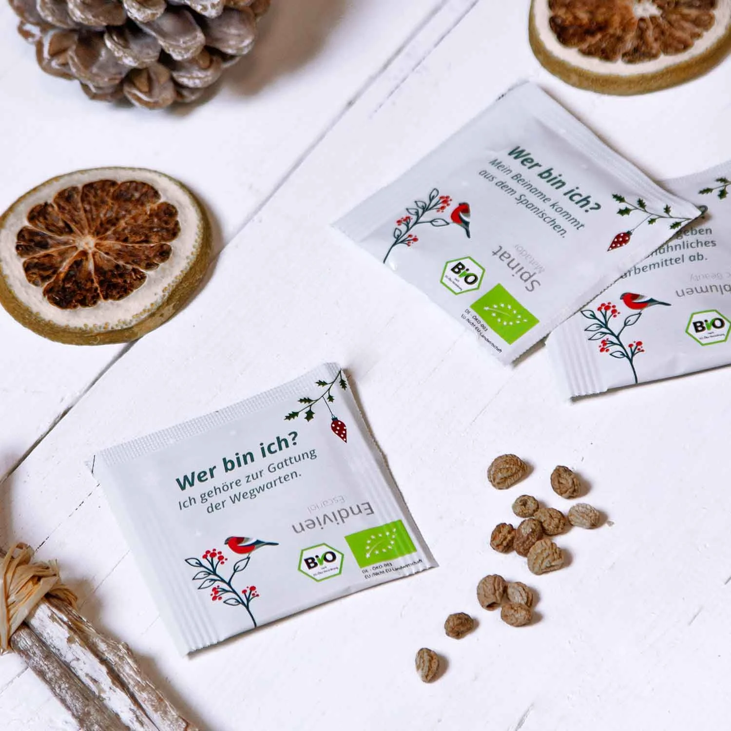 Zrównoważone nasiona organiczne zawarte w kalendarzu adwentowym nie zawierają GMO i są nasionami odmian ustalonych. Dzięki temu rośliny można łatwo rozmnażać i cieszyć się warzywnymi i ziołowymi rarytasami przez długi czas. Ponadto intensywne smaki wszystkich odmian są inspirujące - nowoczesne odmiany nie mogą zaoferować takiego bogactwa smaku.