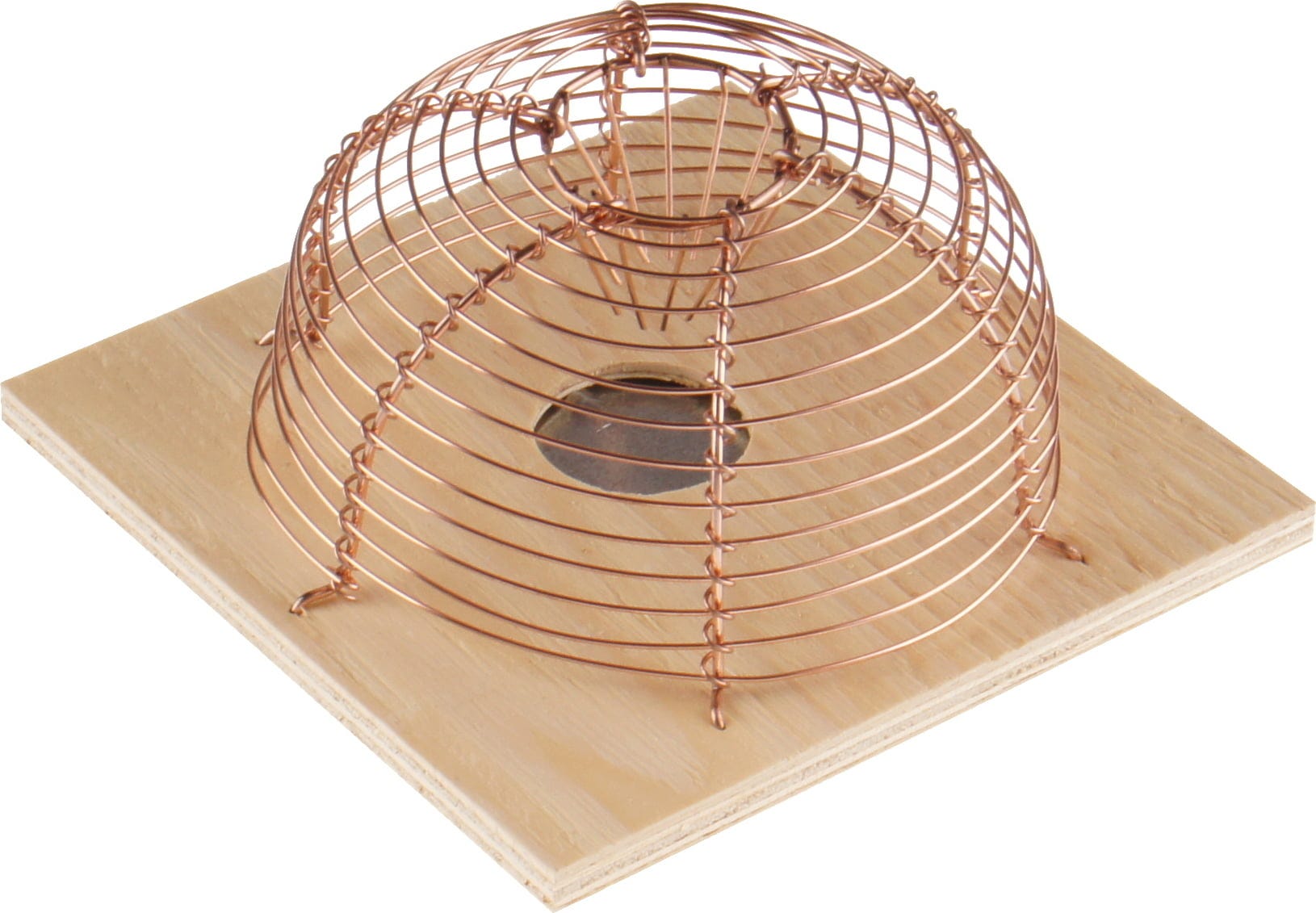 Okrągły, solidny druciany kosz na drewnianej płycie jest idealny do łapania żywych myszy w sposób przyjazny dla zwierząt.