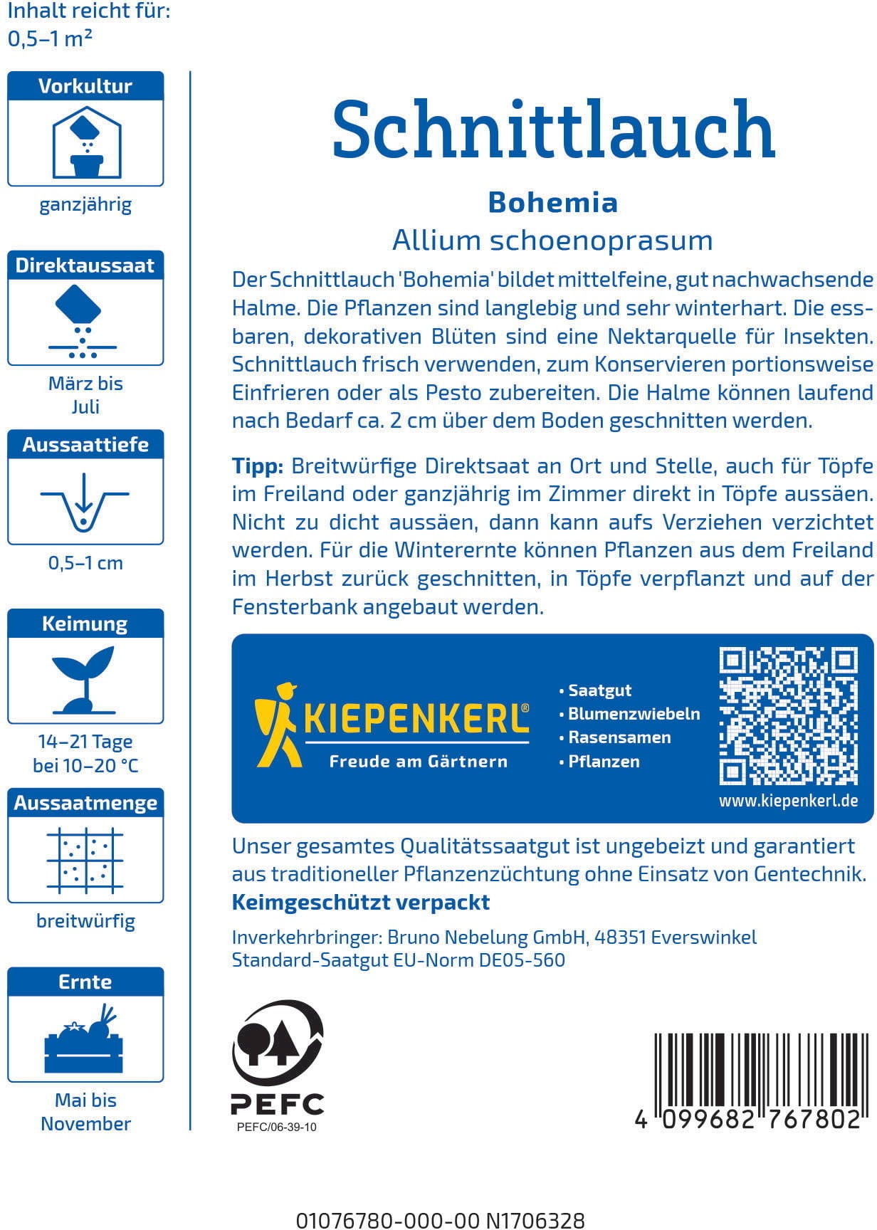 Szczypiorek "Bohemia" to wytrzymała i łatwa w pielęgnacji odmiana, której nie powinno zabraknąć w żadnym ogrodzie ani na balkonie. Dzięki swojemu aromatycznemu smakowi uszlachetnia zupy, sałatki, potrawy z jajek i wiele innych dań. Szczególnie praktyczne: łodygi niezawodnie odrastają i można je wielokrotnie zbierać na świeżo.