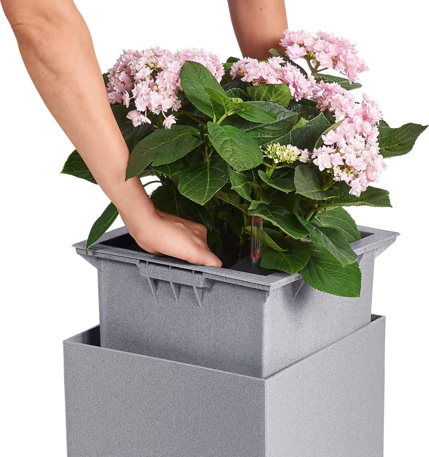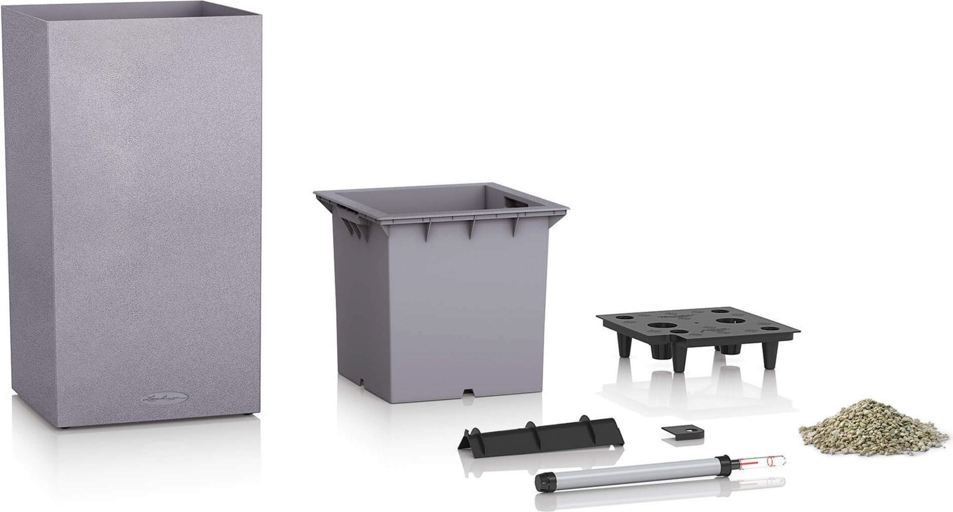 Zestaw zawiera donicę, wkładkę na rośliny i zestaw do podlewania.