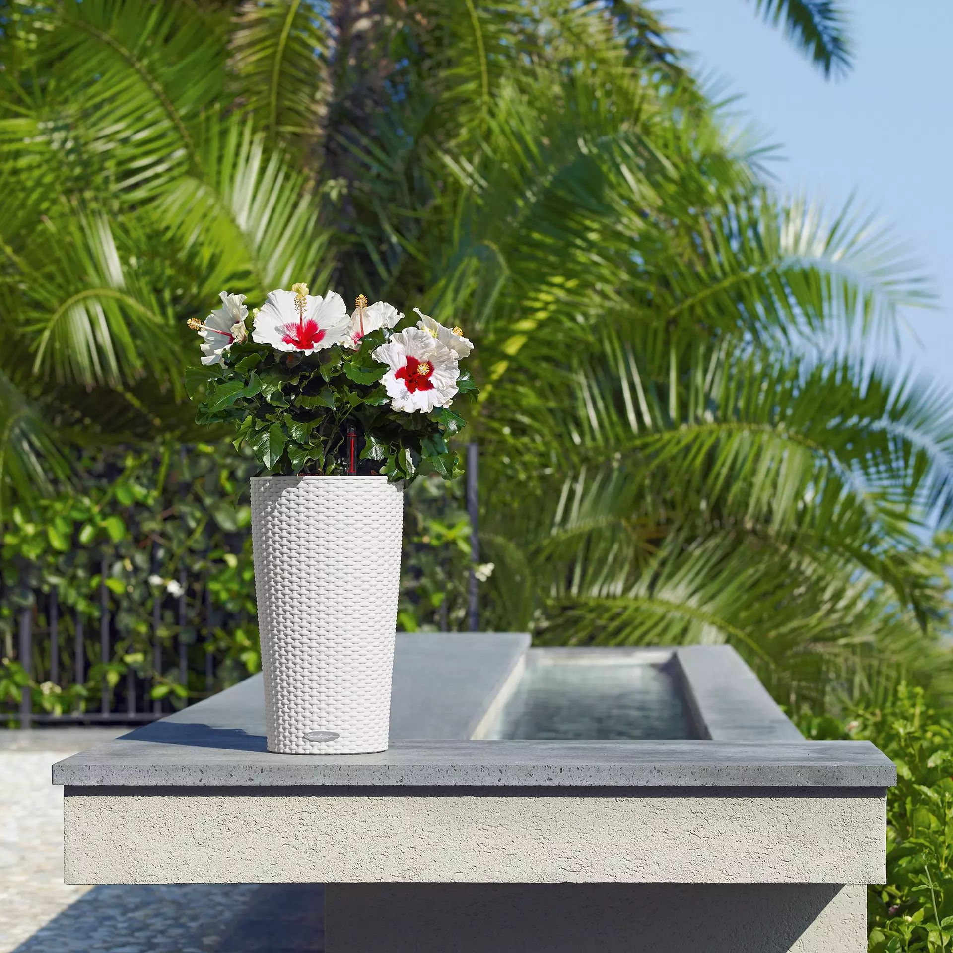 Wąska kolumna do sadzenia roślin Cilindro jest idealna do projektowania indywidualnych koncepcji pomieszczeń w domu, w biurze lub w pomieszczeniach biznesowych. Prosta elegancja i atrakcyjna wiklinowa struktura skutecznie wyeksponują rośliny. Ale doniczka jest nie tylko atrakcyjna wizualnie: dzięki opatentowanemu systemowi nawadniania rośliny są samowystarczalne dzięki zbiornikowi na wodę. Dzięki praktycznej funkcji przelewania woda nie zalega w donicy, nawet gdy jest ona używana na zewnątrz.
