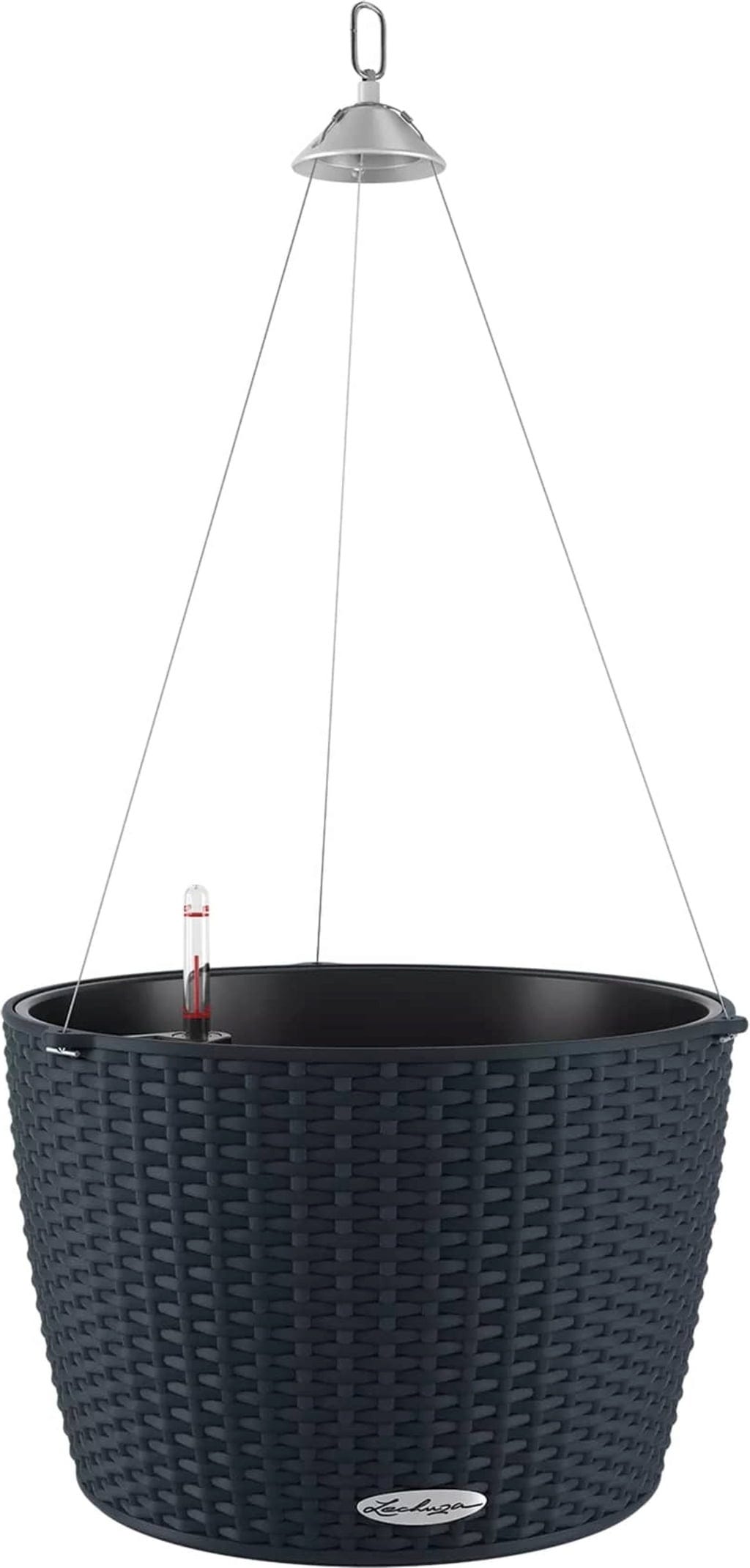W zestawie: zestaw "All-in-One", składający się z donicy, wkładu na rośliny, zestawu do podlewania Lechuza i uchwytu do zawieszania ze stali nierdzewnej