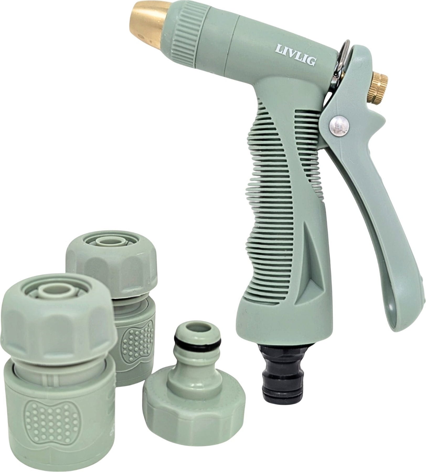 - 4-częściowy zestaw do podlewania składający się z dyszy rozpylającej, przyłącza kranowego (G3/4 cala), szybkozłącza (1/2 cala) i adaptera zatrzymującego wodę (1/2 cala)