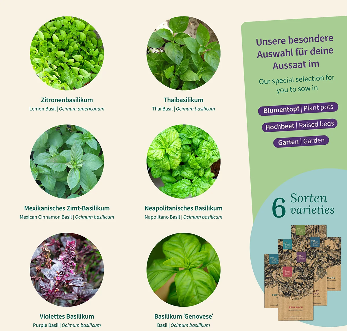 - 6 różnych odmian nasion bazylii