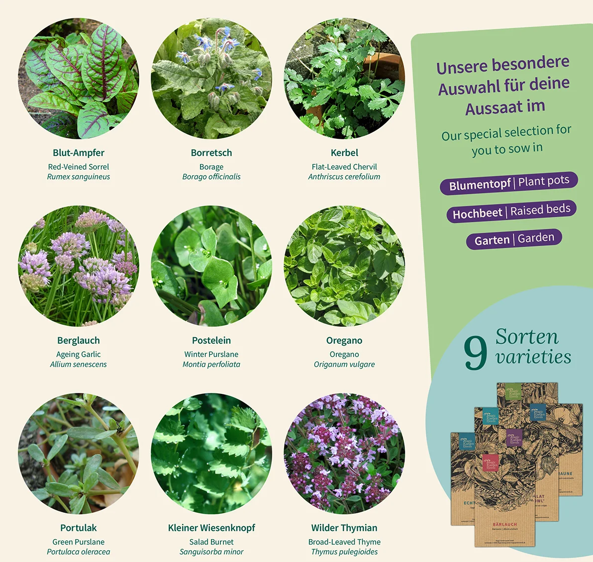 - Zestaw z 9 różnymi rodzajami nasion dzikich ziół