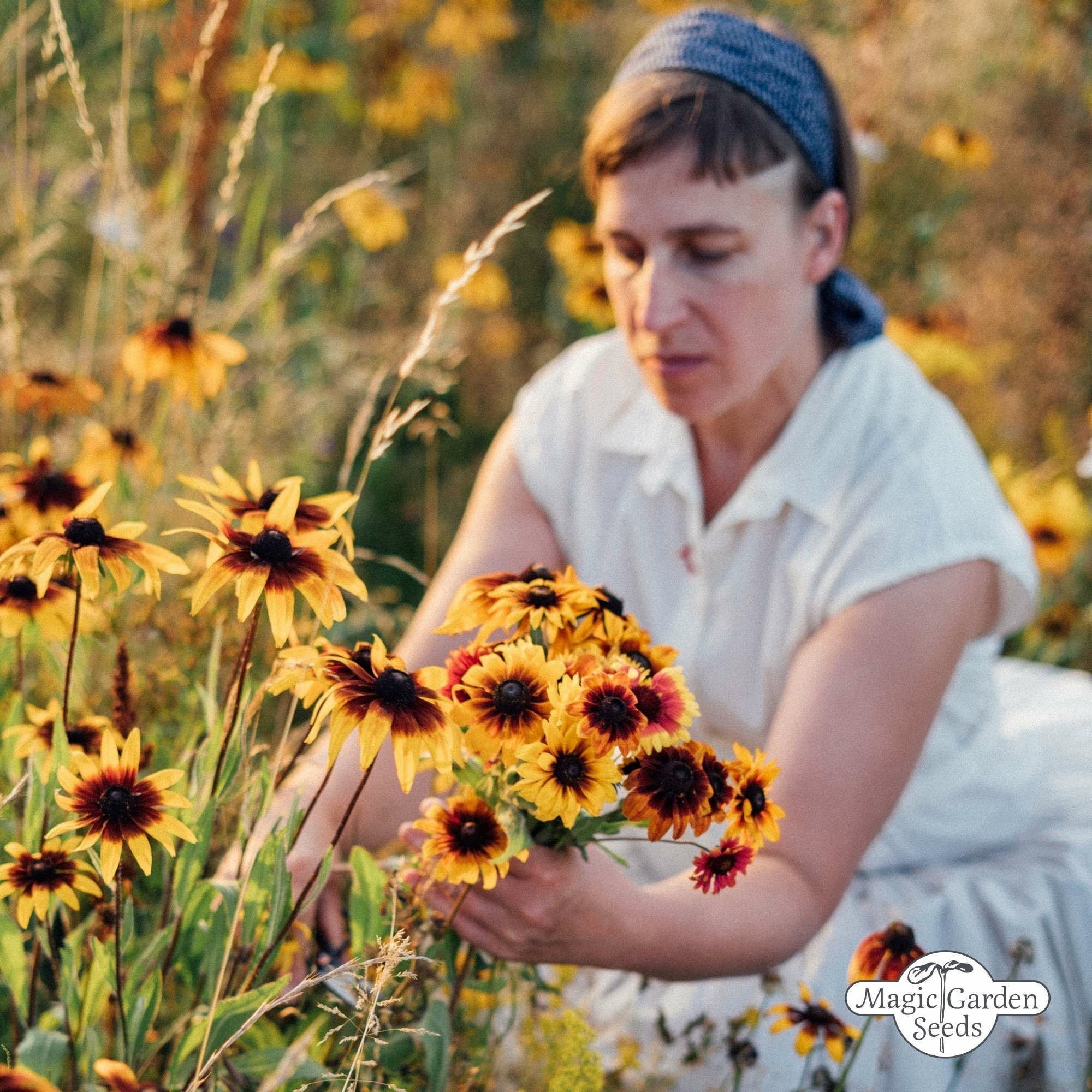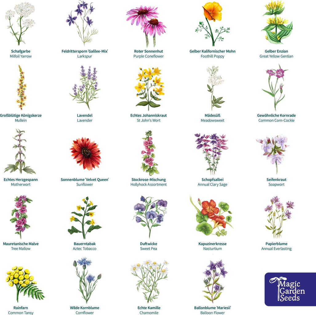 - Wypełniony torebkami nasion dzikich kwiatów, jednorocznych kwiatów letnich, pnączy i bylin wieloletnich