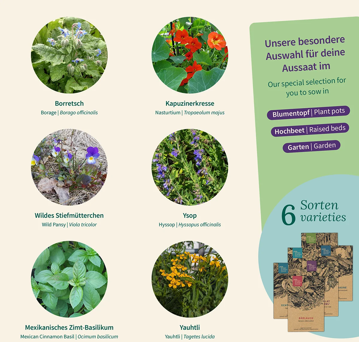 - 6 różnych odmian nasion jadalnych kwiatów