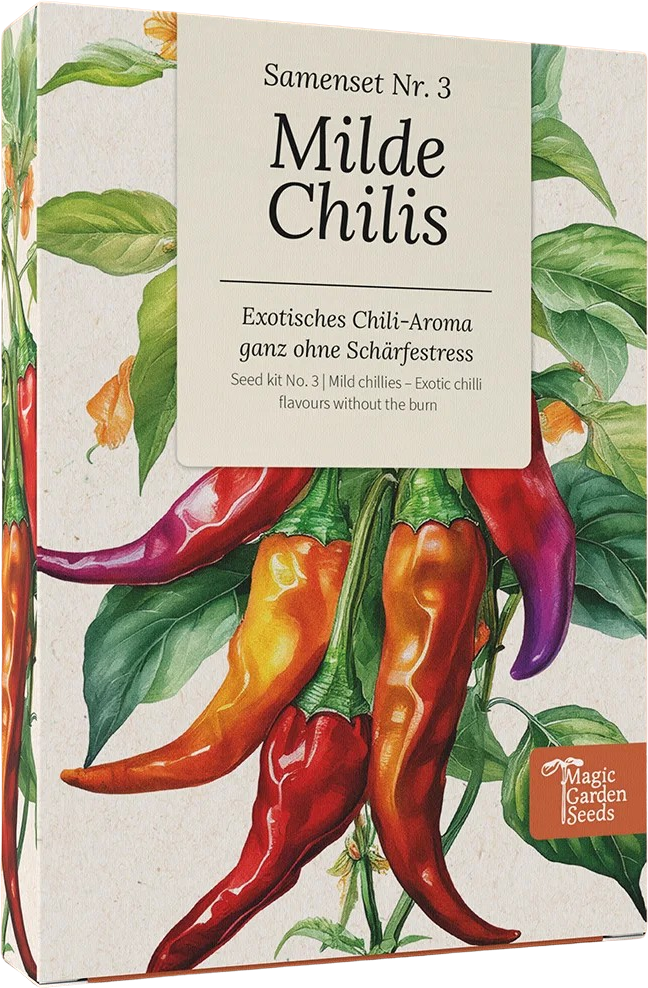 Chili nie zawsze musi być bardzo ostre – udowadnia to ten starannie skomponowany zestaw nasion z 6 łagodnymi odmianami. Zapewniają one pełnię egzotycznego aromatu pysznych strąków, nie przytłaczając przy tym ostrością. Uprawa jest dziecinnie prosta w ogrodzie, na podwyższonej grządce lub na balkonie – to świetny wstęp do świata chili.