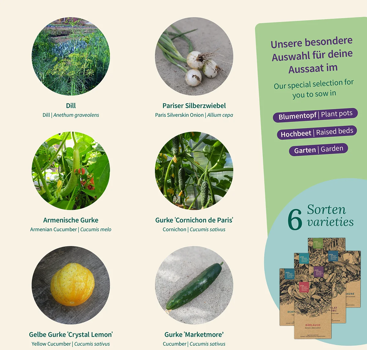 - 6 różnych rodzajów nasion (4x ogórek, 1x cebula srebrzysta, 1x koper)