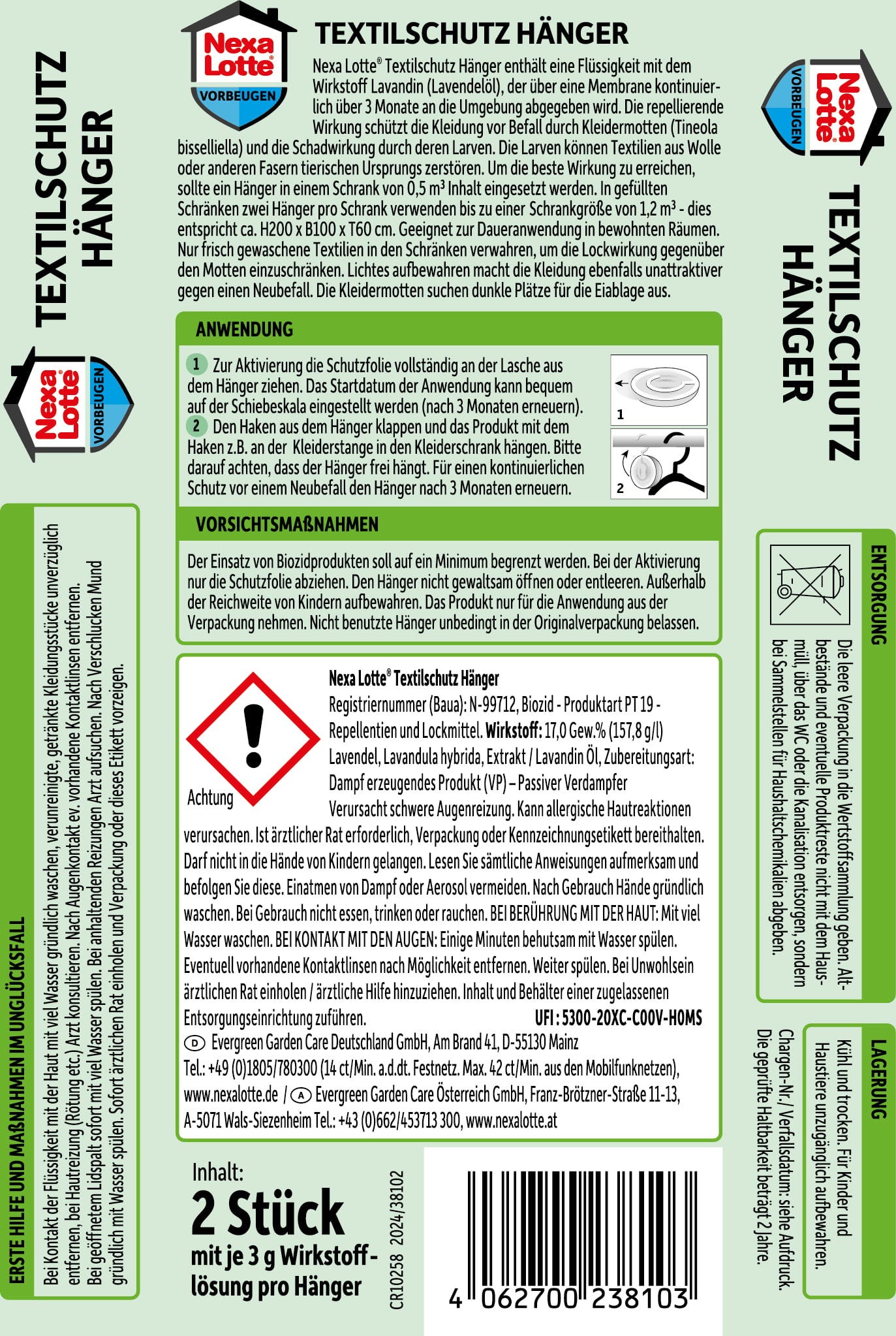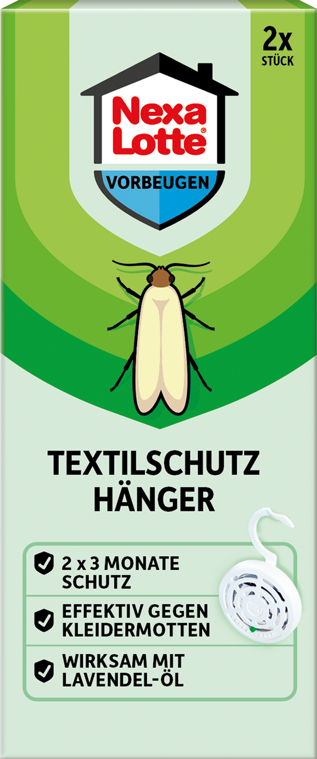 Zawieszki ochronne Nexa Lotte niezawodnie chronią tekstylia przed molami odzieżowymi i wydzielają przyjemny, subtelny zapach. Aktywny składnik lawandynowy z olejku lawendowego jest uwalniany do środowiska przez okres do 3 miesięcy i skutecznie chroni ubrania przed inwazją moli odzieżowych (Tineola bisselliella). Dziury nie mają więc szans.