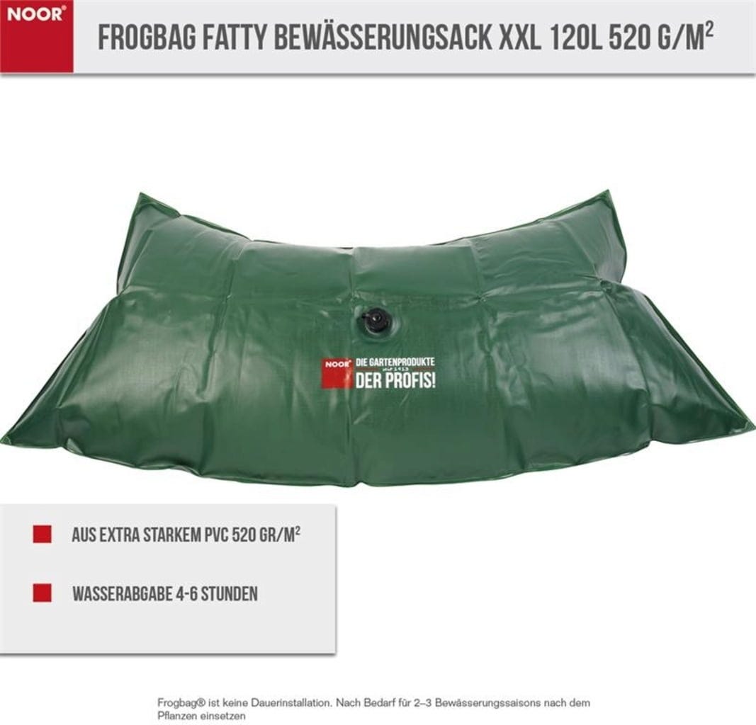 Worek nawadniający „Fatty” nadaje się przede wszystkim dla starszych drzew o szerokim pniu i może być stosowany również w połączeniu z nawozami płynnymi. Oczywiście jest on przeznaczony do wielokrotnego użytku i oprócz wody pozwala zaoszczędzić mnóstwo czasu. Uwalnianie wody odbywa się w ciągu 4 do 6 godzin, co skutecznie zapobiega wypłukiwaniu gleby.