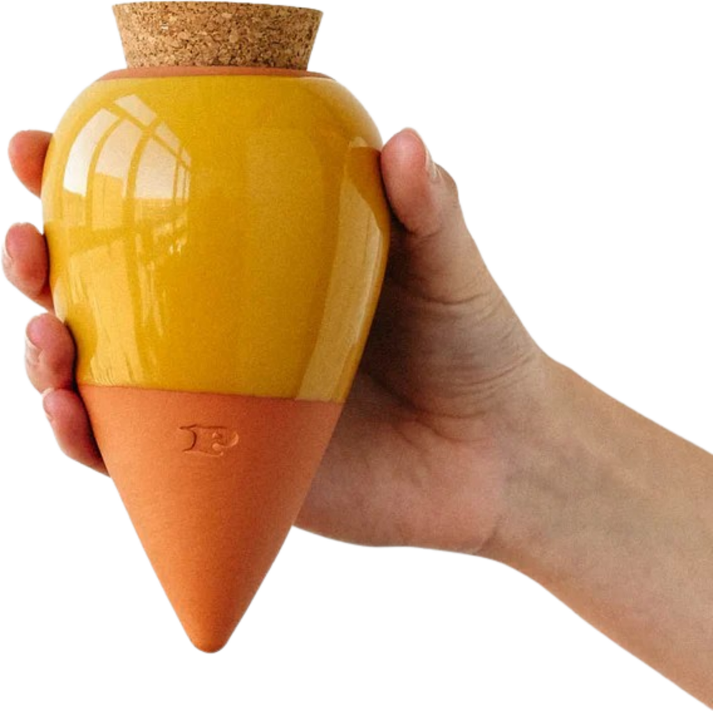 Olla to nie tylko dekoracja, ale raczej praktyczny dodatek do roślin doniczkowych. Gliniany stożek reguluje przepływ wody i zapewnia roślinie nawilżenie przez całą dobę.