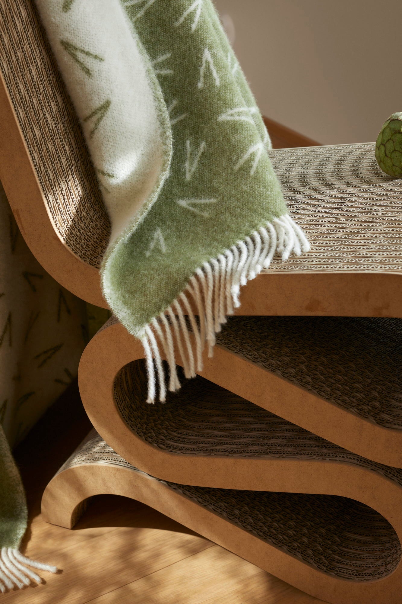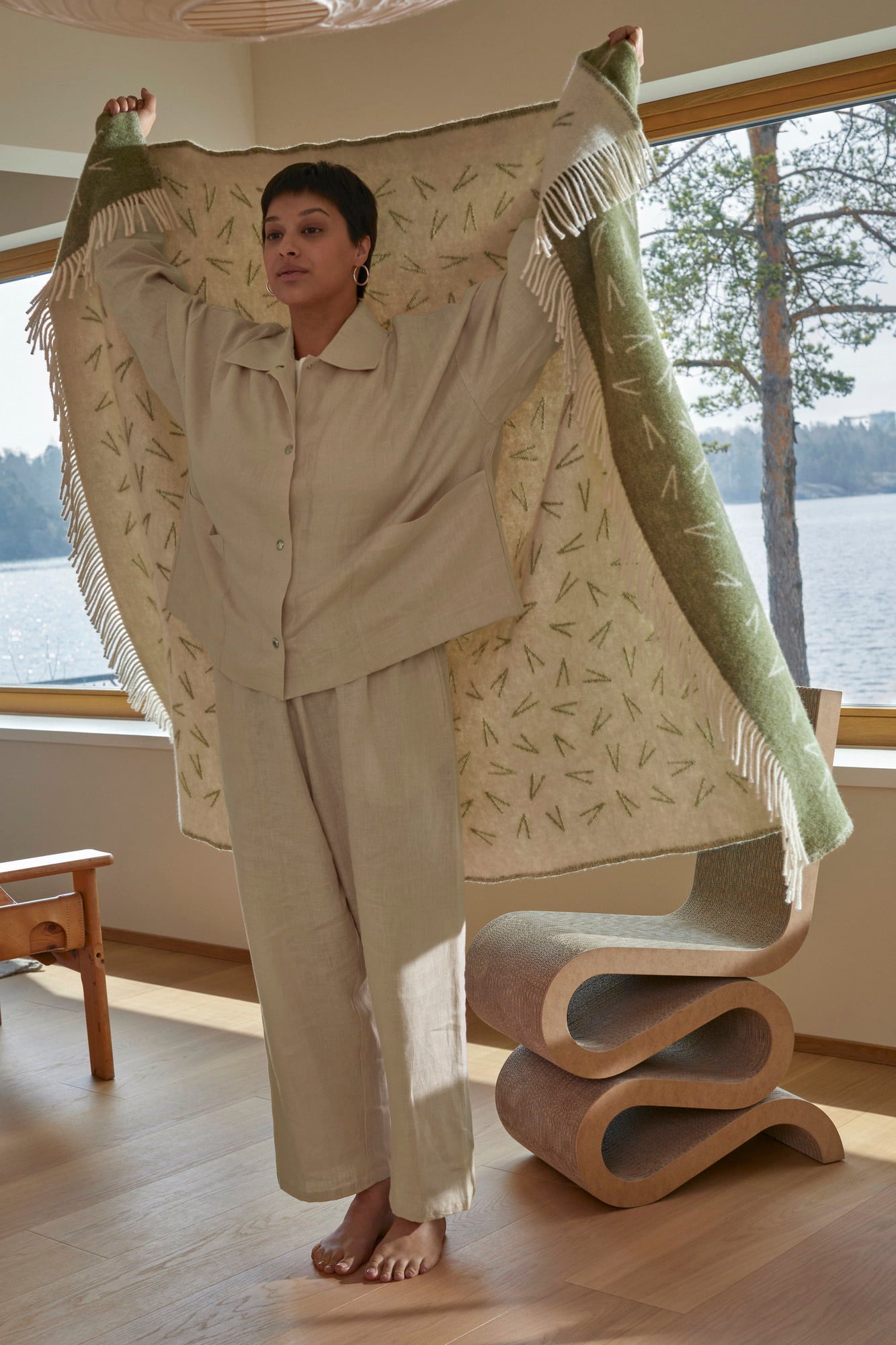 Ziemia, śnieg i woda - z czarującym wzorem inspirowanym opadłymi igłami sosny, ten miękki koc wykonany z etycznie produkowanej wełny nowozelandzkiej jest pięknym i przytulnym towarzyszem na chłodne letnie wieczory na balkonie lub przytulne zimowe popołudnia w salonie.