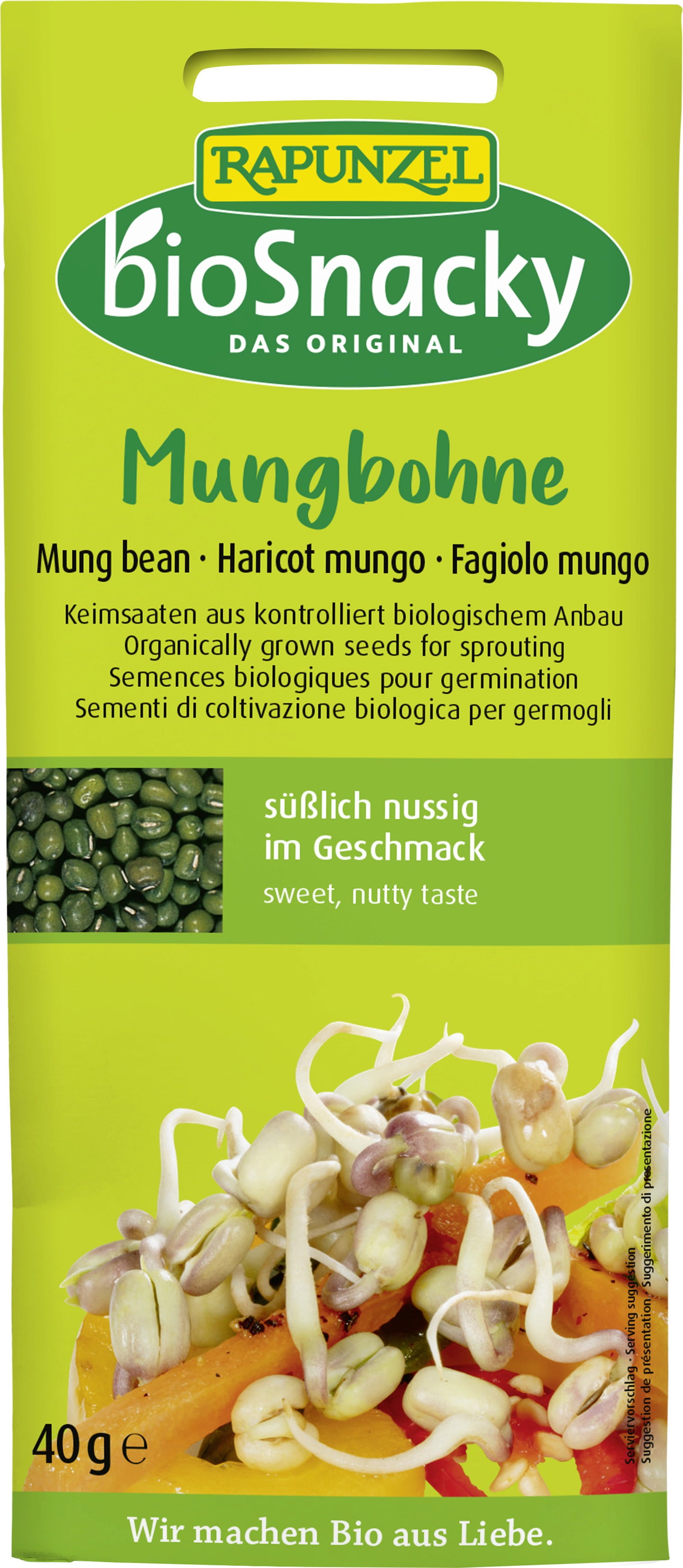 Kiełki fasoli mung smakują słodkawo i orzechowo, dzięki czemu idealnie nadają się do potraw z patelni wok, do wrapów oraz sałatek. Czas kiełkowania wynosi od trzech do pięciu dni. Ziarna do kiełków fasoli mung Rapunzel pochodzą z kontrolowanych upraw ekologicznych.