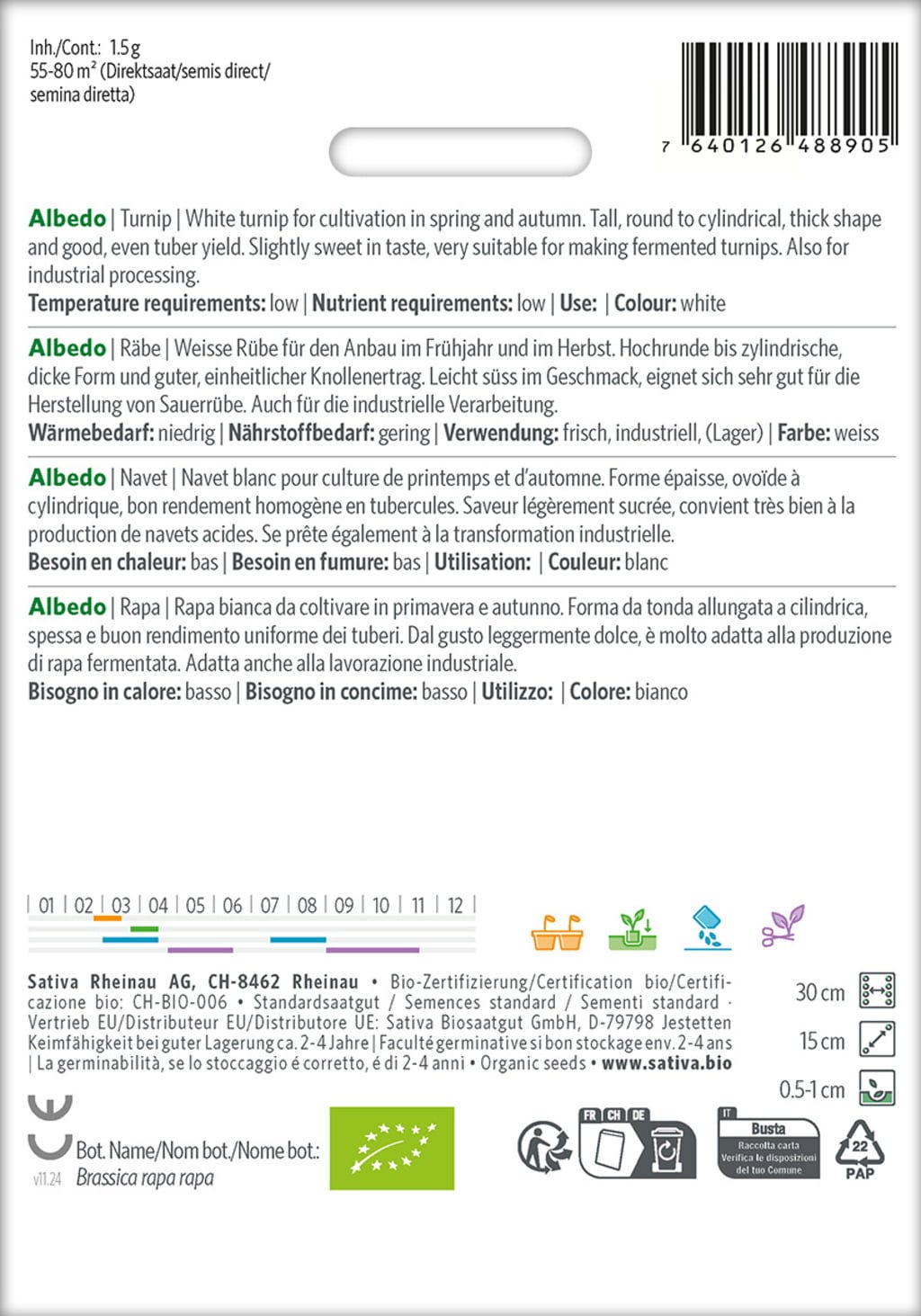 Biała rzepa Albedo jest idealna do uprawy wiosną i jesienią i zachwyca jednolitym, wysokim, okrągłym lub cylindrycznym kształtem. Daje dobry, równomierny plon bulw i ma przyjemnie łagodny, słodki smak. Jest szczególnie odpowiednia do produkcji rzepy kwaśnej i jako odmiana ProSpecieRara pochodzi ze starannych prac konserwacyjnych prowadzonych przez Sativa.