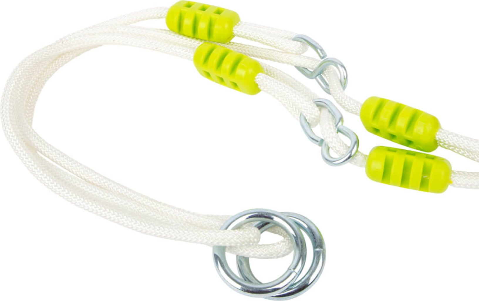 - W zestawie liny, metalowe pierścienie i karabinki śrubowe