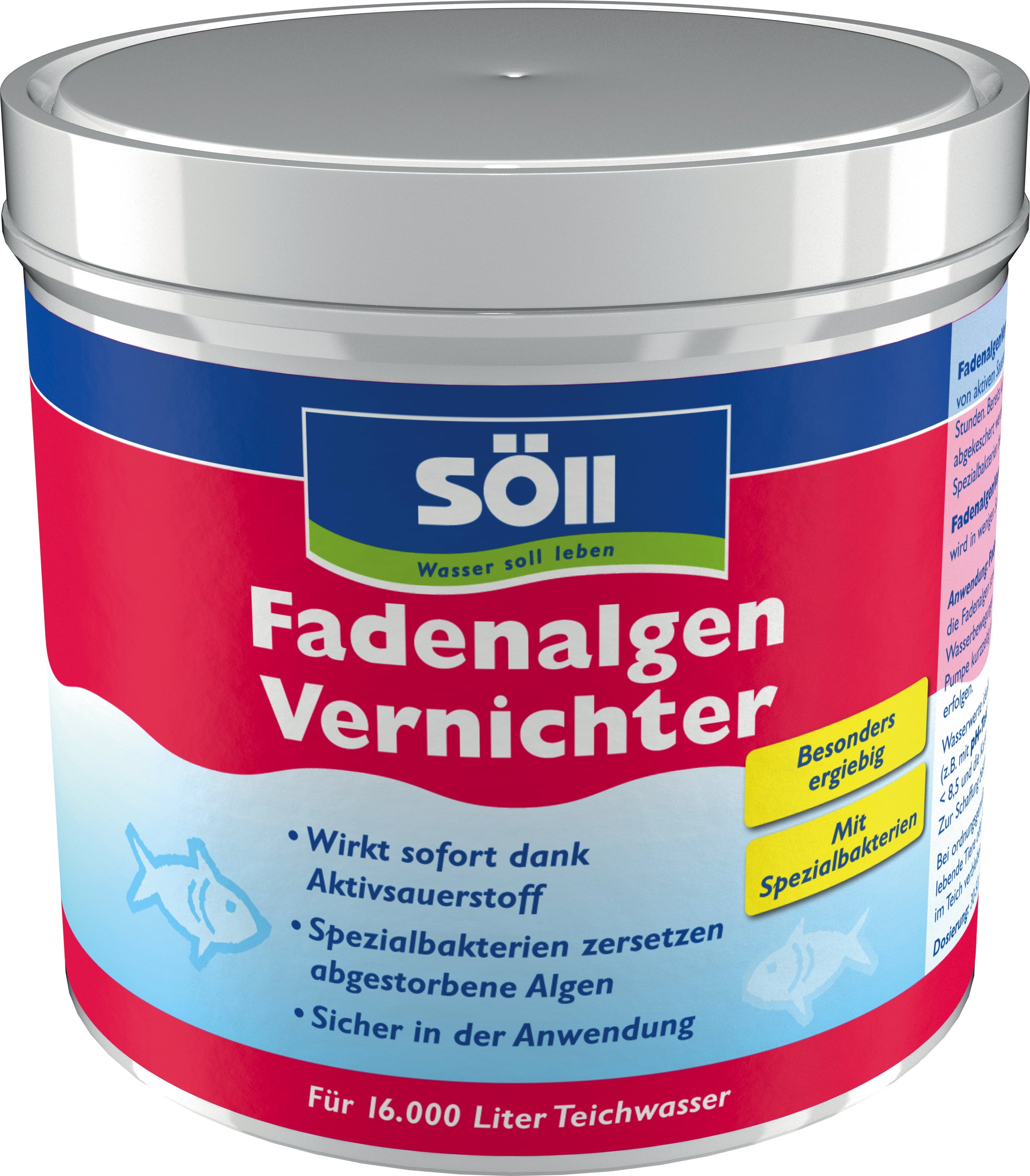 FadenalgenVernichter firmy Söll to bezbarwny i wydajny preparat stabilizujący wzrost glonów. W ciągu 24 godzin uwalnia aktywny tlen i niszczy nadmiar glonów. „Zniszczone” glony można wkrótce potem usunąć siatką. Resztę robią specjalne bakterie zawarte w produkcie: przyspieszają proces rozkładu martwych glonów. FadenalgenVernichter rozkłada się na wodę i tlen w ciągu kilku godzin.
