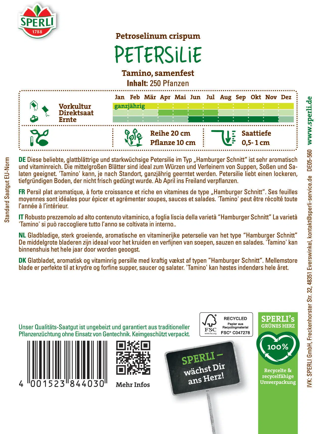 Pietruszka o gładkich liściach "Tamino" firmy SPERLI jest mocna, aromatyczna i bogata w witaminy. Średniej wielkości liście doskonale nadają się do przyprawiania zup, sosów i sałatek. Tamino może być uprawiana na zewnątrz, w szklarni lub w doniczkach. Może być wysiewana przez cały rok, szczególnie na zewnątrz od marca do sierpnia, w miejscach słonecznych lub półcienistych.