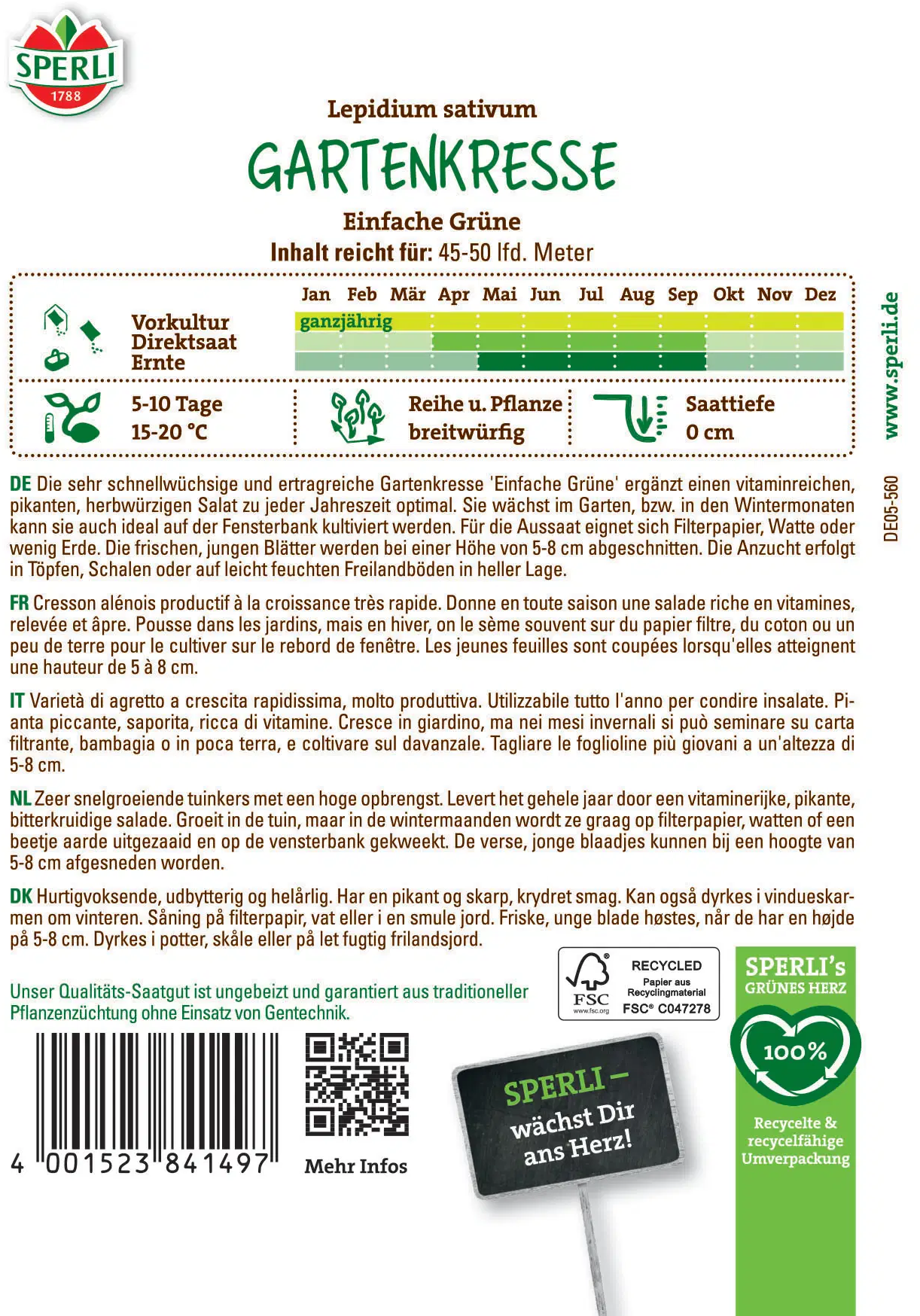 Rzeżucha ogrodowa Einfache Grüne jest szczególnie wydajna i łatwa w uprawie zarówno w pomieszczeniach, jak i na zewnątrz. Szybko kiełkuje i gęsto rośnie, dzięki czemu pierwsze liście można zebrać już po kilku dniach.