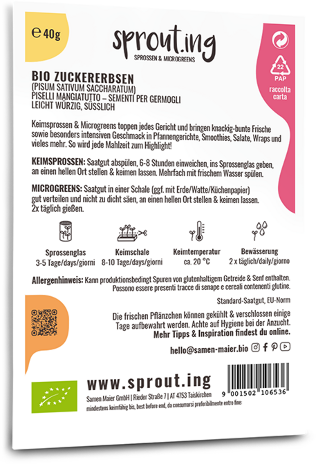 Sprout.ing Organiczny groszek cukrowy, 40 g