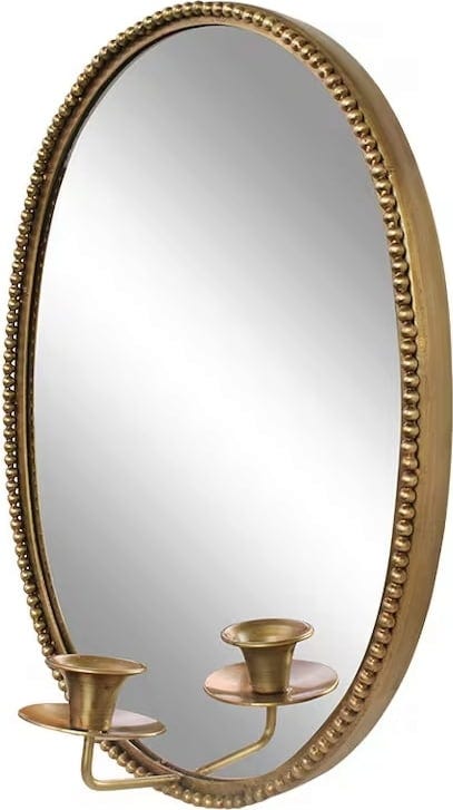 Lustro Louise zachwyca eleganckim wyglądem antycznego mosiądzu i dekoracyjną krawędzią z małymi, drobnymi kropkami. Zintegrowany mosiężny świecznik na świece stołowe zapewnia stylowe odbicie światła świec, tworząc ciepłą, zachęcającą atmosferę. Ten wszechstronny element dekoracyjny doskonale pasuje do różnych przestrzeni mieszkalnych i dodaje uroczego, nostalgicznego akcentu do każdej atmosfery.