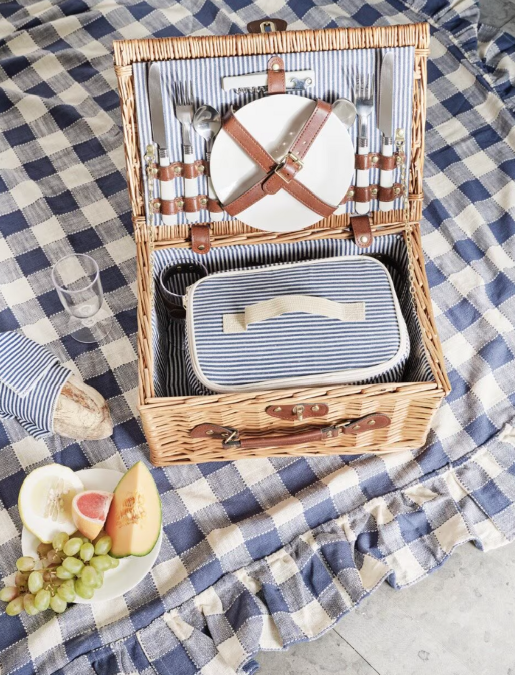 Kosz piknikowy jest starannie tkany i wyściełany materiałem w niebieskie paski – idealny na relaksujące chwile w parku, na plaży lub w ogrodzie. Oferuje mnóstwo miejsca na jedzenie i napoje, łącząc styl z praktyczną funkcjonalnością na każdą okazję.