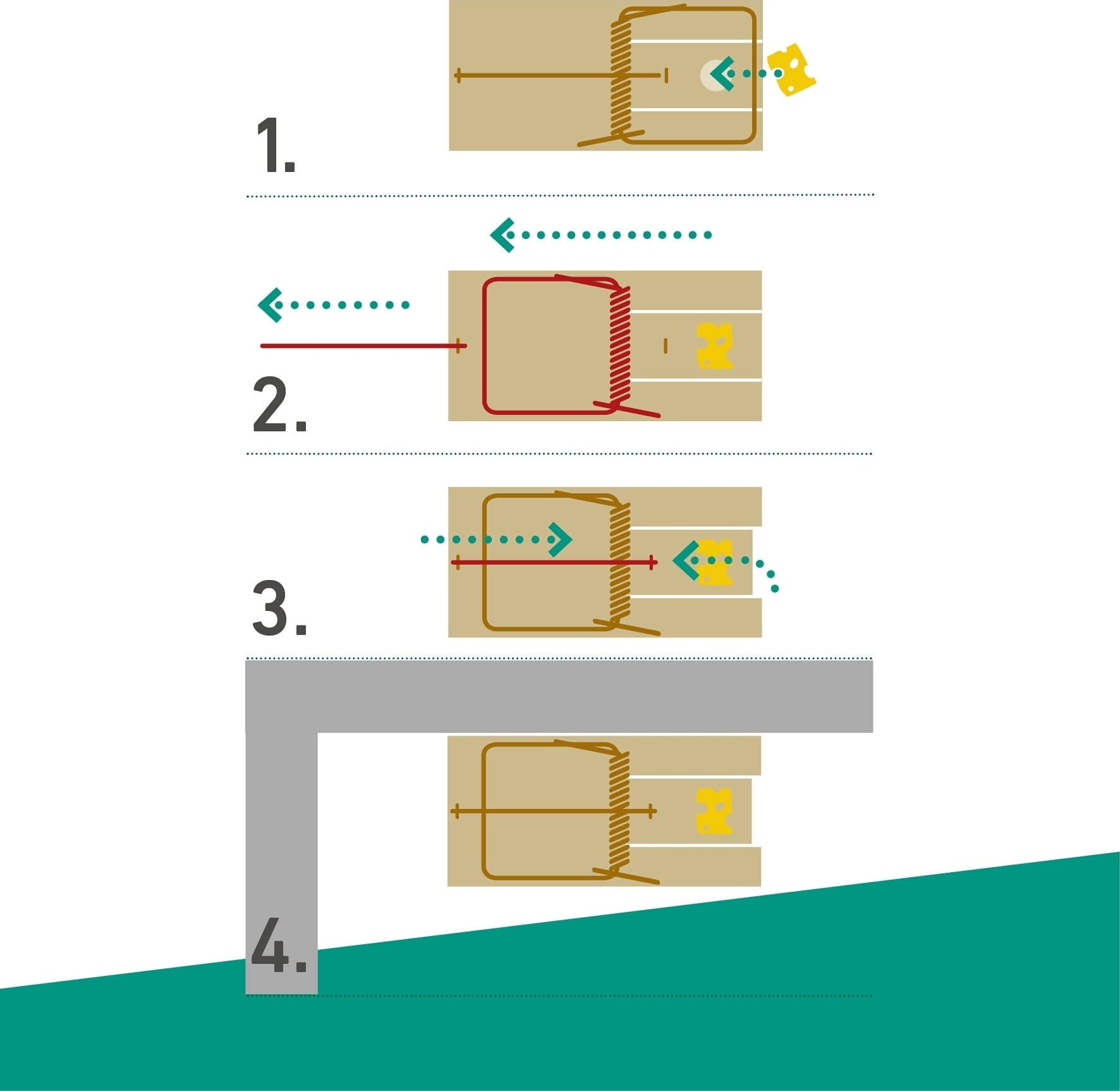 Zastosowanie: Położyć kawałek sera lub boczku na uchwycie na przynętę, ostrożnie napiąć mocną sprężynę i ustawić pułapkę równolegle do ściany.