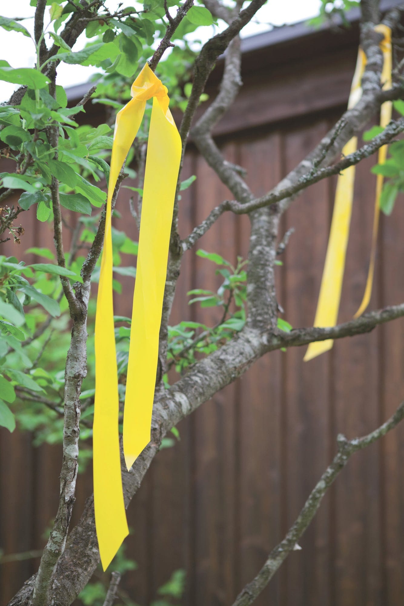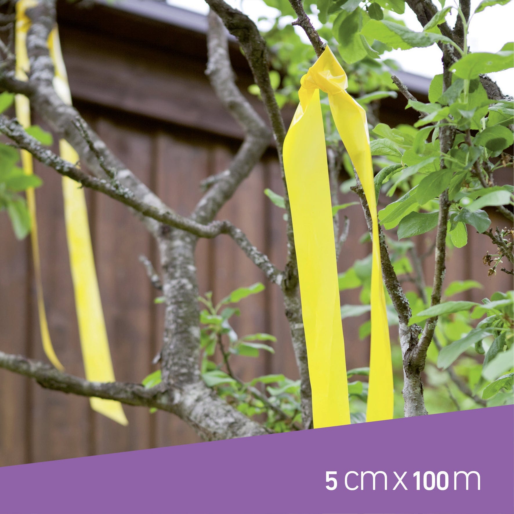 Odetnij 50 cm taśmy i przymocuj ją do drzewa lub krzewu, aby w przyszłości owoce były bezpieczne przed ptakami. Żółty kolor sygnalizacyjny i trzepotanie taśmy na wietrze utrzymają ptaki z dala od ogrodu.
